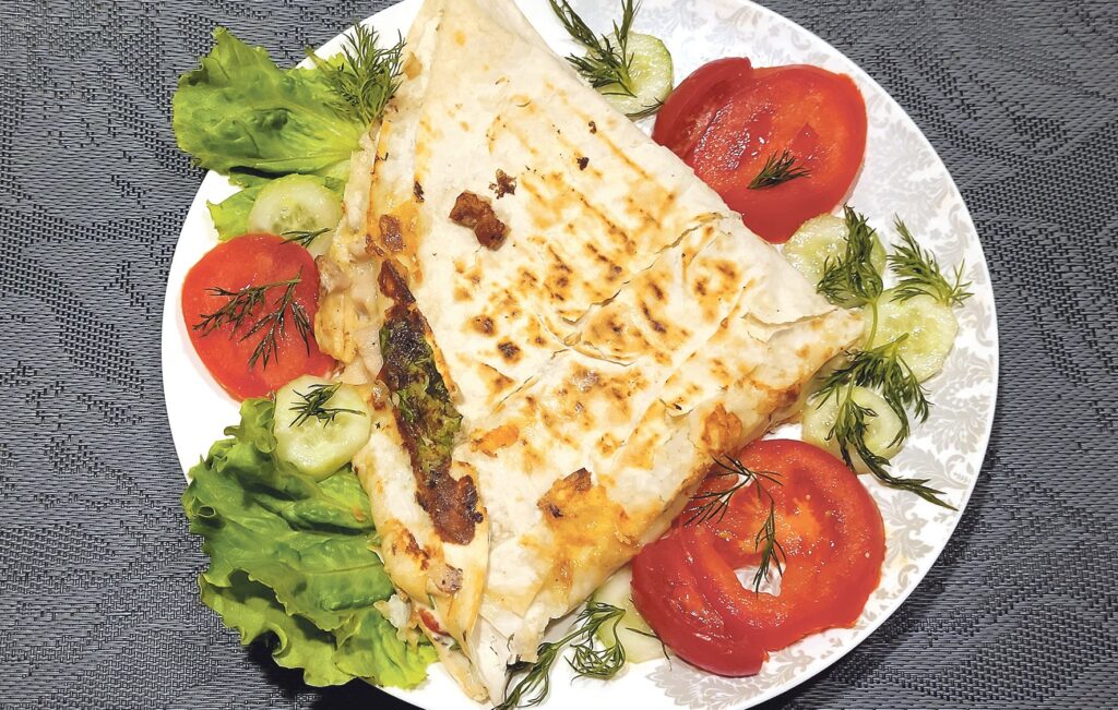 Puscieto sieru sarīvēju, gabaliņu vārītās cāļa gaļas ruletes sīki sagriezu. Nomazgāju un apsusināju papīra dvielī dažas salātlapas, kā arī tomātus, ko sagriezu plānās ripiņās. Piegriezto lavaša ripu pārsmērēju ar kausēto sieru, šoreiz bija ar baravikām. Tad lavašu iegriezu līdz vidum, domās sadalot to četrās daļās. Katram segmentam izmantoju citādāku pildījumu. Sākot no kreisās puses, vispirms vienai daļai pāri mīkstajam sieram izlīdzināju gaļu, nākamajai – lapu salātus, tad – tomātu ripiņas, bet ceturtajai daļai – rīvēto sieru. Uzmanīgi pārlocīju segmentus citu citam pāri tā, lai izveidotos trīsstūris ar dažādajiem pildījumiem iekšpusē. Uz sausas grila pannas apcepu to no abām pusēm, līdz lavašs kļuva sauss un siers sāka kust.