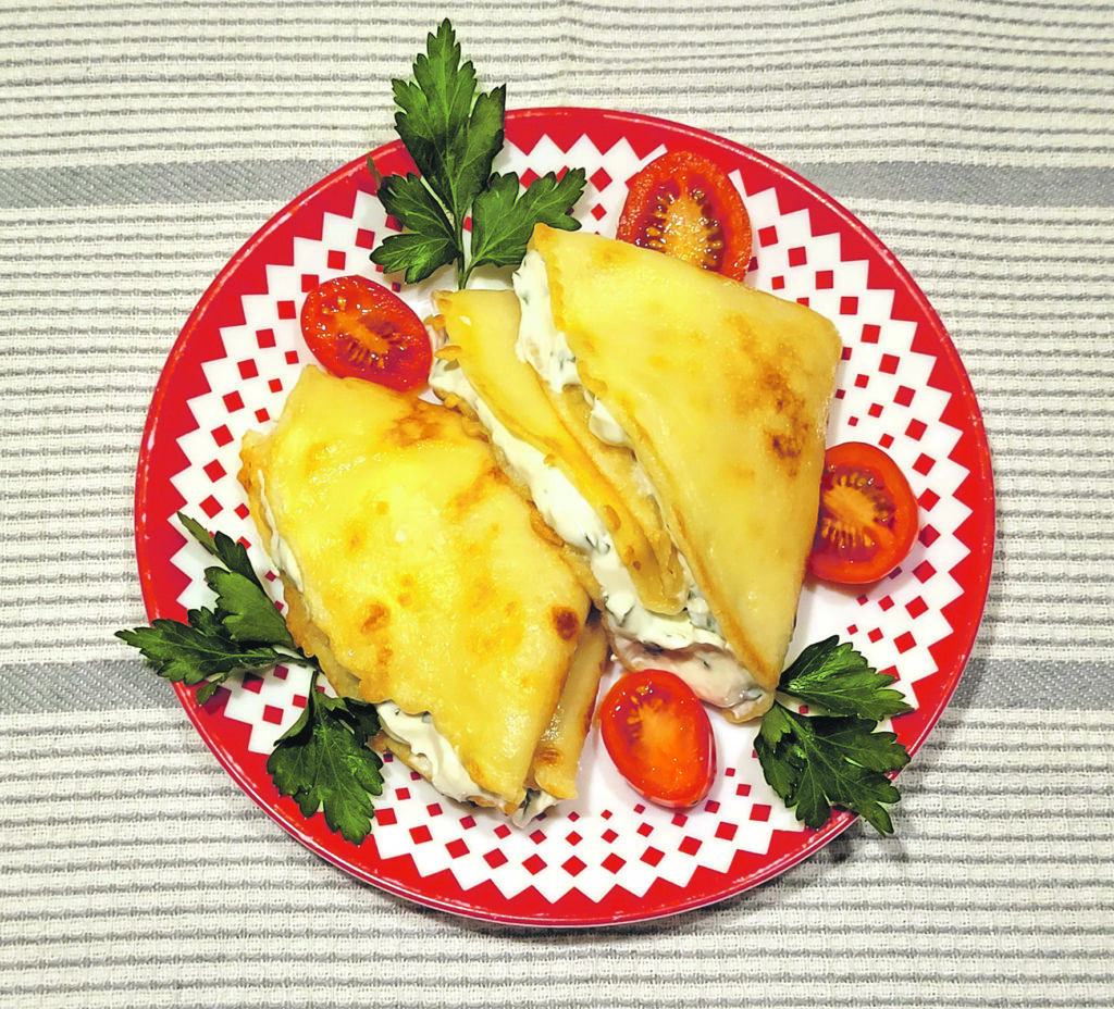 Neliela diametra pannu ietaukoju ar augu eļļu, uzkarsēju un tad ar kausiņu ielēju mīklu, pannu vēl pagrozot, lai mīkla vienmērīgi pārklātu tās dibenu. Uz vidēji stipras uguns cepu pankūkas apmēram pusotru minūti no katras puses, līdz tās kļuva viegli zeltainas, pēc tam saliku uz šķīvja citu virs citas. Ja pildījumam ņemam receptē ieteikto brinzu, tā jāsarīvē uz vidēji rupjas rīves. Šoreiz izmantoju viegli sālīto sieru “Favita”, kas, lai gan pasāļš, jau ir krēmīgas konsistences un nebija jārīvē. Tam tikai pievienoju skābo krējumu – daudzumu varam regulēt pēc garšas un raudzīties, cik biezu pildījumu vēlamies, lai tas būtu vidēji biezs un ērti smērējams. Sīki sagriezu pētersīļu lapiņas un arī piemaisīju baltajai masai. Ja ir pieejami receptē ieteiktie koriandra jeb kinzas zaļumi un to garša šķiet patīkama, varam izmantot tos. Pati gan tos vēl neesmu nogaršojusi. Pildījumu pārsmērēju pankūkai, tad to pārliecu uz pusēm, mazliet piespiežot, pēc tam – vēlreiz uz pusēm un izveidoju trīsstūri. Tā sagatavoju vēl arī dažas no pārējām. Pikantas un gardas. No šīs mīklas ceptās pankūkas lieliski garšoja arī ar ievārījumu vai medu.