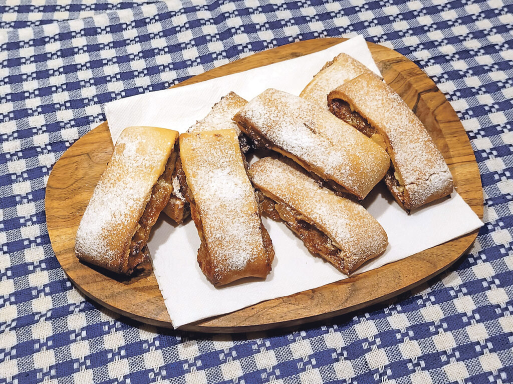 Mīklai olu saputoju kopā ar sāli, parasto un vaniļas cukuru viendabīgā krēmā. Pievienoju atlikušo citrona sulu, 50 gramu kausēta sviesta, iesijāju miltus ar cepamo pulveri un samīcīju vidēji stingru mīklu, kas nelīp pie rokām, – piespiežot ar pirkstu, tajā jāpaliek bedrītei. Mīklu liku uz cepamā papīra loksnes un izveltnēju apmēram 40 x 20 centimetru lielu taisnstūri, raugoties, lai malas būtu līdzenas. Pagriežot mīklas plāksnes garāko malu pret sevi, vienmērīgi uzklāju tai līdz pusei ābolu pildījumu. To pārsedzu ar mīklas brīvo malu – ar cepamā papīra palīdzību izdevās salaiduma vietu pavirzīt apakšā. Ja tas neizdodas, maliņas, lai pildījums turētos iekšpusē, jāsalipina kopā un jāaizspaida ar dakšiņu. Pildīto taisnstūri sagriezu strēmelēs un liku tās uz plāts, kas izklāta ar cepamo papīru. Cepu līdz 180 grādiem uzkarsētā cepeškrāsnī, līdz tās kļuva gaiši brūnas, -vismaz 20 minūtes. Tad gardās sloksnītes mazliet padzesēju un caur sietiņu pārkaisīju ar pūdercukuru.