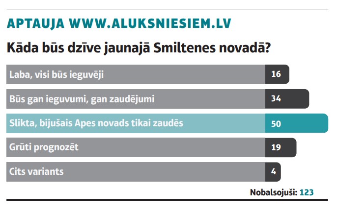 “Facebook.com” grupas “Smiltenes novada attīstībai” administrators Andris Pauls – Pāvuls teic, ka mēnesi pēc vēlēšanām ir nestabilitātes sajūta, jo jaunā novada vadība, viņaprāt, netika izveidota politiski loģiski un atbilstoši vēlēšanu rezultātiem. “Stabili būtu, ja novada domes vadībā ikdienā strādātu priekšsēdētājs ar diviem vietniekiem, kas pārstāv bijušos Apes, Raunas un Smiltenes novadus. Man šķiet, izveidotā “konstrukcija saļodzīsies” ap apvienotā novada budžeta pieņemšanas laiku, jo Raunas novads palicis bez pārstāvības vadībā. Kopumā Smiltenes novada vēlēšanas liecina par novadnieku vēlmi pēc pārmaiņām. No 33 iepriekšējiem Apes, Raunas un Smiltenes novadu deputātiem apvienotā novada domē ievēlēti tikai trīs. Domes sastāvs ir stiprs un kolorīts – trīs deputāti ar Saeimas darba pieredzi, vēl trīs studējuši politikas zinātni un uzņēmēji bez pieredzes politikā,” norāda A. Pauls – Pāvuls no Smiltenes pagasta.
