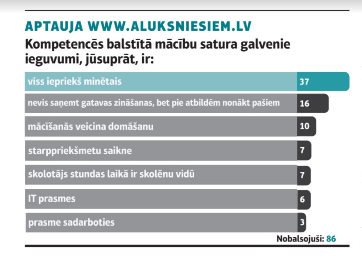 “Kompetenču ieviešanas laiks ir mācīšanās laiks skolēniem, skolotājiem un vecākiem. Īpaši atbildīgs darbs ir skolotājiem, jo viņiem jāapzina jaunais mācību saturs, jāizvēlas mācību materiāli, jo mācību grāmatas visos mācību priekšmetos nav izdotas. Jāprot atlasīt savai klasei, skolēniem nepieciešamākais, arī darbam individuāli. Jāapgūst vērtēšana, katrai stundai jāparedz sasniedzamais rezultāts. Vienlaicīgi jāstrādā gan klasēs, kur ir kompetenču pieeja, gan nav. Jāpiedalās dažādos kursos un tas jāpārrunā metodiskajās komisijās, interešu grupās, jāapgūst jaunas tehnoloģijas. Tas ir darbietilpīgs un laikietilpīgs process. Tieši šajā laikā būtiska ir sadarbība visām izglītības procesā iesaistītajām pusēm – skolēniem, skolotājiem, vecākiem, pašvaldībai. Ir jāapgūst prasmes ieklausīties, sadzirdēt, uzticēties.