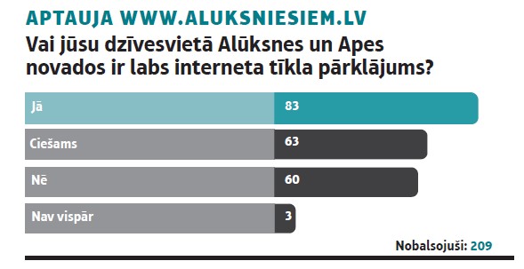 Laikraksta “Alūksnes un Malienas Ziņas” pētījuma “Interneta tīkla pārklājums Alūksnes un Apes novados” ietvaros lūdzu Alūksnes un Apes novadu iedzīvotājiem vietnē www.visidati.lv aizpildīt aptaujas anketu par interneta lietošanu mājās. No 132 iegūtajām novadu iedzīvotāju atbildēm noskaidrojās, ka 130 respondentiem ir nepieciešams internets mājās, lai strādātu vai veiktu citas darbības, kas pieejamas ar interneta palīdzību.