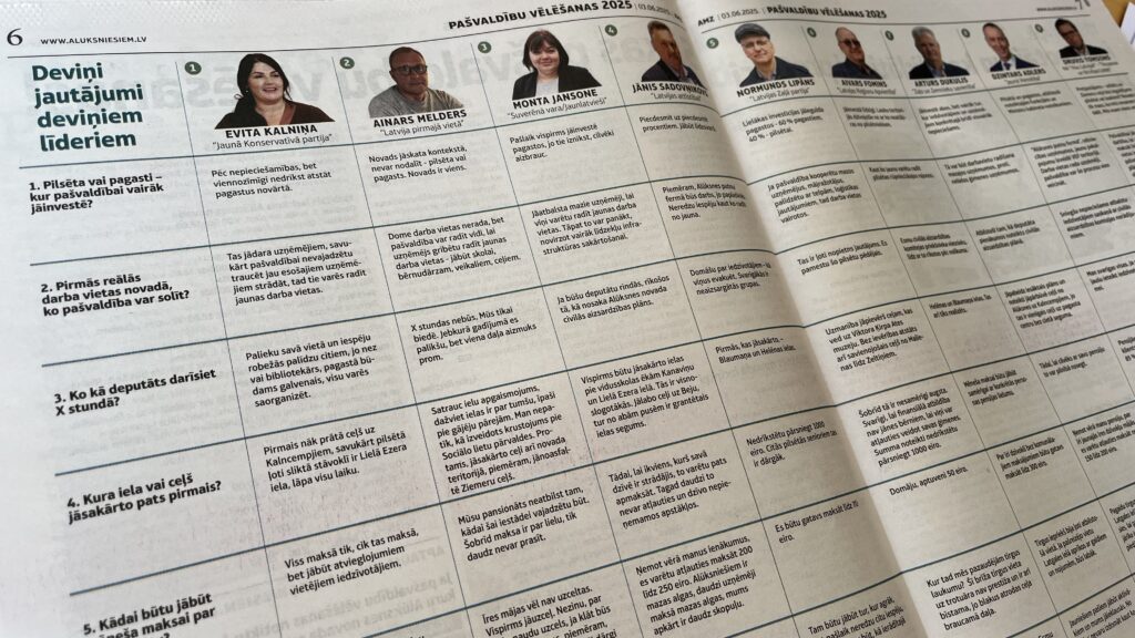Kur ieguldīt vairāk – pilsētā vai pagastos? Kāda ir pirmā solāmā darba vieta, ko pašvaldība var radīt? Un ko deputāts īsti darīs konkrētā dienā pēc ievēlēšanas? No ceļiem un pansionāta maksas līdz jauniešu atbalstam un pēdējam bibliotēkas apmeklējumam – šie atklātie, vienkāršie jautājumi ļauj izprast gan prioritātes, gan attieksmi.