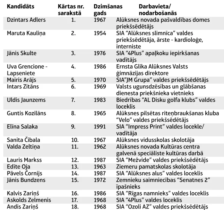 Dz. Adlera komandā šajās vēlēšanās balotējas gandrīz tie paši deputātu kandidāti, kuri sarakstā bija pirms četriem gadiem. Sarakstu papildinājis Intars Zitāns, kurš savulaik pārstāvēja partiju “Jaunais Laiks” un tagad, beidzot savas profesionālā darba gaitas, atgriežas novadā uz pastāvīgu dzīvi. Daži “JV” biedri bija gatavi savu vietu šī gada sarakstā atdot jaunajiem – tā komandā iekļuva Elīna Salaka – jauna, perspektīva, darbīga jauniete. “Viņa nekautrējās ienākt politikā un saka, ka ir gatava palīdzēt stiprināt mūsu novada iedzīvotāju labklājību,” saka Dz. Adlers. Komanda, kā norāda tās līderis, ir vienādi domājoša, pragmatiska, tādēļ arī pastāvīga.