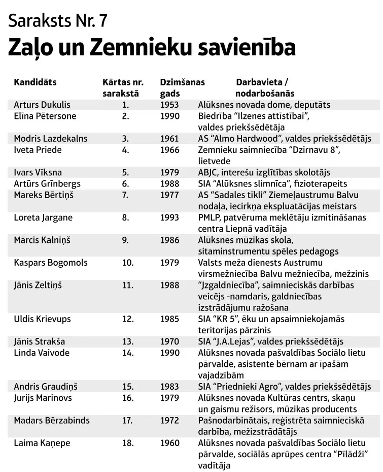 Pašvaldību vēlēšanās Alūksnes novadā ar 7. numuru startē Zaļo un Zemnieku savienības (ZZS) saraksts Artura Dukuļa vadībā. A. Dukulis novada deputātu kandidātu plejādē ir ar vienu no lielākajām pieredzēm – viņš bijis gan ciema, gan rajona, gan pilsētas deputāts un ZZS pārstāvniecībā pašvadību vēlēšanās startē kopš 2013. gada. No 2013. līdz 2021. gadam bijis novada pašvaldības vadītājs. Iepriekšējās vēlēšanās ZZS ieguva četrus mandātus un strādāja opozīcijā. Līdz ar to, kā pats atzīst, pārzina visas domes darba šķautnes, gan “skatuvi”, gan “virtuvi”. “Un šīs zināšanas var iegūt tikai pieredzes veidā, to nevienā skolā nemāca,” viņš uzsver.