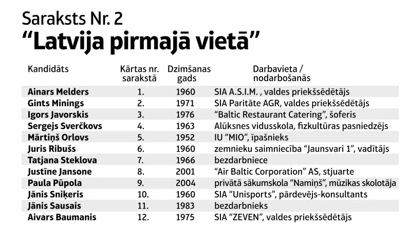 Diviem no kandidātiem ailīte “nodarbošanās” rakstīts bezdarbnieks. “Jā, manā partijā ir divi kandidāti, kuri šobrīd nav darba attiecībās, jo pašvaldība likvidēja štata vietas, bet tas nemazina viņu spējas. Viņu pienesums pašvaldībai var būt tieši tāds pats, kā pārējo kandidātu,” vērtē A. Melders.