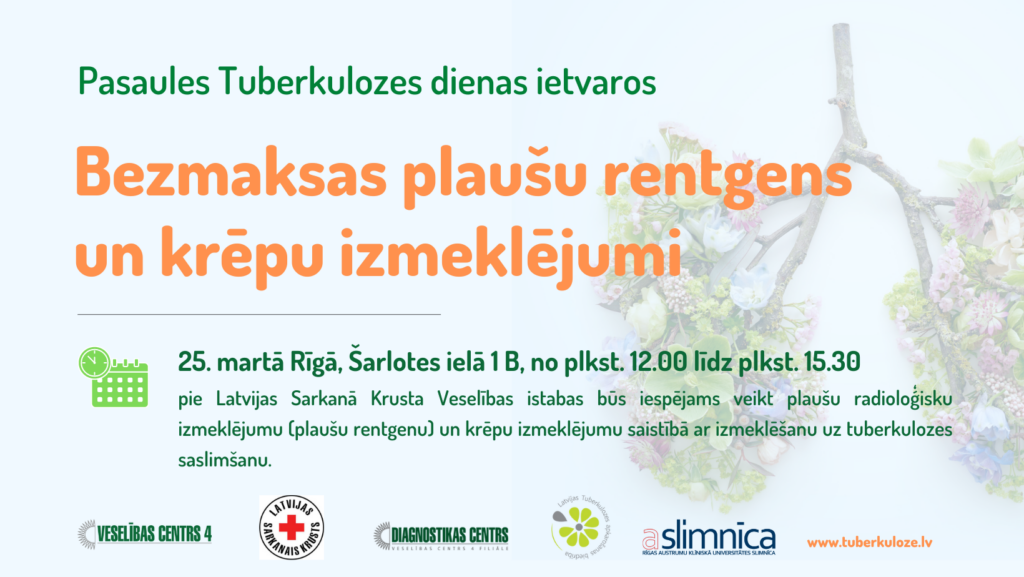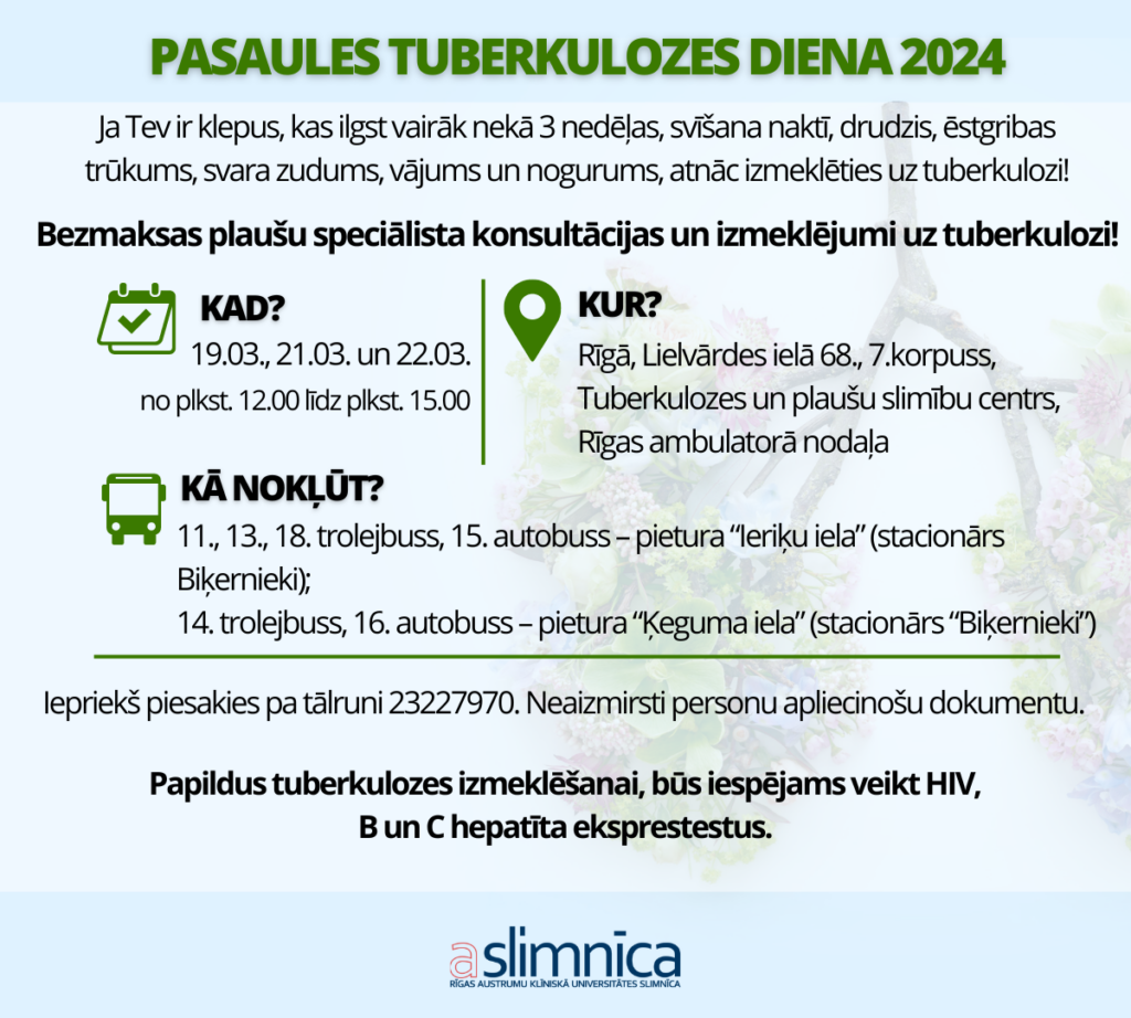Šogad, 24. martā, tiek atzīmēta Pasaules Tuberkulozes diena, tādēļ šajā nedēļā Rīgas Austrumu klīniskās universitātes slimnīcas (Austrumu slimnīcas) ārsti aicina ikvienu cilvēku, kuram, piemēram, vairāk kā 3 nedēļas nepāriet klepus vai ir izteikts nogurums un vājums – atnākt un saņemt plaušu speciālista konsultāciju un/vai izmeklēties uz tuberkulozi. To varēs izdarīt bezmaksas, Austrumu slimnīcas