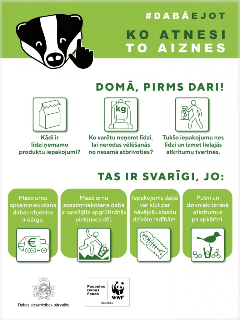 “Dabā ejot. Ko atnesi, to aiznes” – ar šādu moto Dabas aizsardzības pārvalde sadarbībā ar Pasaules dabas fondu Latvijā īsteno informatīvu kampaņu ar mērķi, ko pati atzīst par ambiciozu, proti, mainīt ļaužu ieradumus, viņiem dodoties atpūsties dabā, un panākt, lai perspektīvā dabas teritorijās nebūtu nevienas atkritumu urnas.