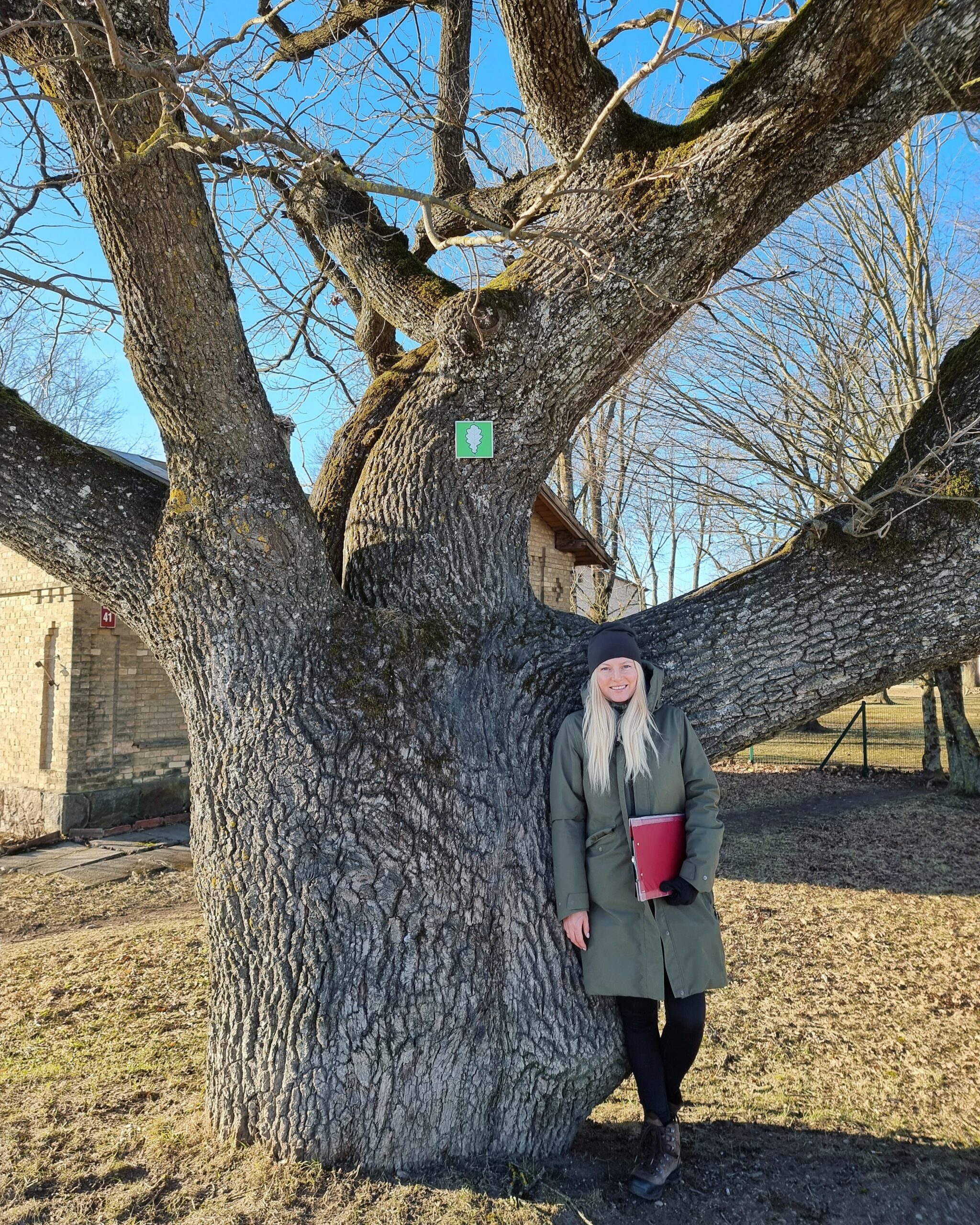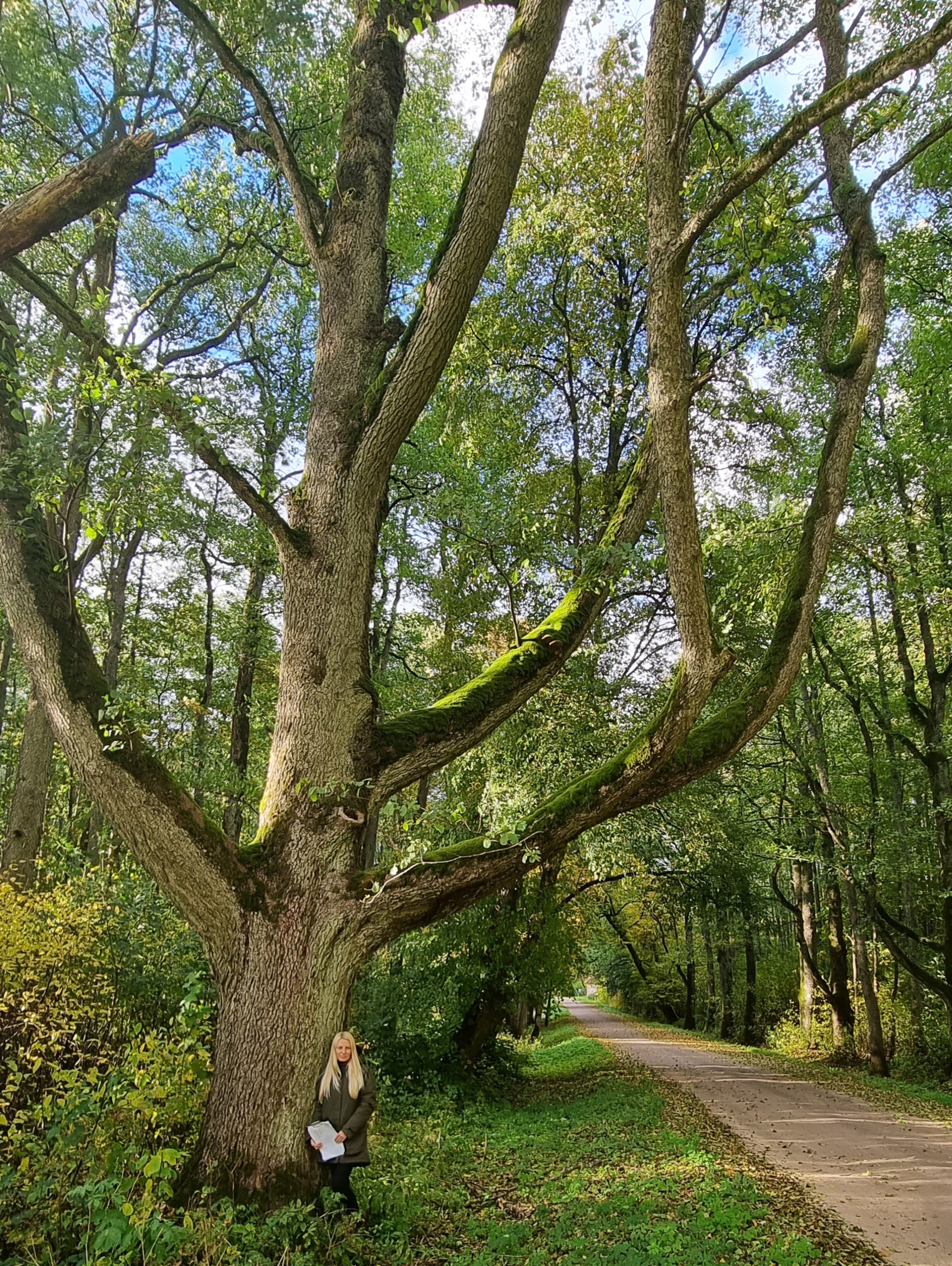 “Paskatoties pirms gadiem datu pārvaldības sistēmā “Ozols”, es pamanīju, ka manā dzimtajā pusē Aucē ir ļoti maz atzīmēto koku, lai arī jau bērnībā daudzus biju ievērojusi. Gribēju, lai šie koki tiek apzināti. Tāpat arī mūsu lauku mājās bija dižkoks – parastais osis, ieraudzīju, cik tas ir liels, varens un apdzīvots. Man kļuva interesanti, kā diez citu sugu koki šādā vecumā izskatās,” stāsta Lāsma Veilande, kas, studējot mežzinātni LLU Meža fakultātē, savā studiju noslēguma darbā 2021. gadā veica dižkoku kvantitatīvo un kvalitatīvo pētījumu Auces novadā. Divu mēnešu laikā, nobraukājot 4133 kilometrus, viņa 517,8 kvadrātkilometru lielā teritorijā atklāja 62 jaunus dažādu sugu dižkokus, papildinot datu pārvaldības sistēmas “Ozols” datu bāzi par 74 % dižkoku Auces pusē.