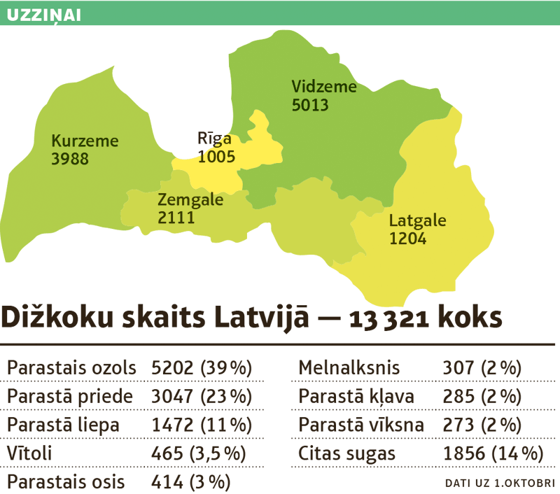 Latvijā dižkoku skaits ir mainīgs – katrs koks, kas ir sasniedzis normatīvajos aktos noteikto apkārtmēru un augstumu, kļūst par aizsargājamu koku, kuram nepieciešama īpaša apsaimniekošana un aizsardzība. Par Latvijas biotopiem, dabas aizsargājamajām teritorijām un arī dižkokiem zinoši ir Dabas aizsardzības pārvaldes (DAP) speciālisti. DAP inspektori katru mēnesi atrod dabā arvien jaunus dižkokus. Pārvaldes pārziņā ir dabas datu pārvaldības sistēma “Ozols”, kurā šobrīd reģistrēts 13 321 dažādu sugu dižkoks. Kā norāda DAP Dabas datu nodaļas vecākā eksperte Irēna Pučkina, pētījumi par dabas daudzveidību apstiprina, ka dižkokos dzīvo arī ļoti daudz Latvijai svarīgo un aizsargājamo sugu – kukaiņi, ķērpji un citas.