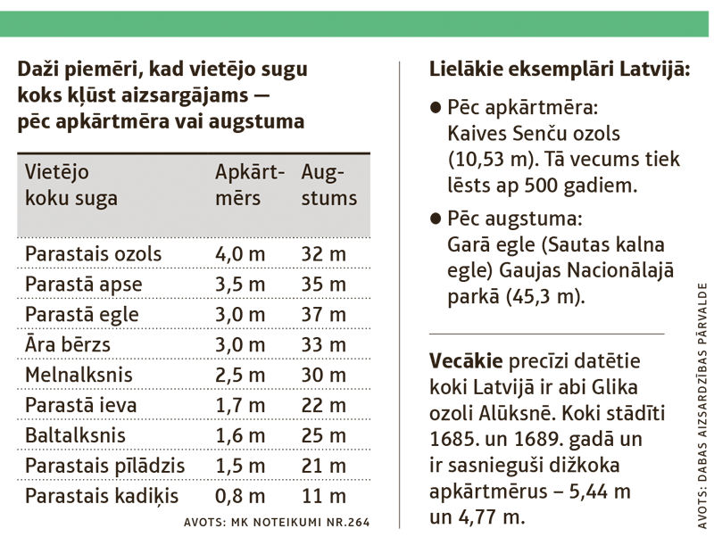 “Ne vienmēr tikai liels, skaists koks ir dižkoks, katrai sugai ir konkrētie apkārtmēri un augstuma parametri. Ministru kabineta (MK) noteikumi Nr.264 ir pamats, lai noteiktu, kurām koku sugām un pēc kādiem parametriem nosaka dižkokus. Šajos noteikumos ir minētas 54 sugas, no kurām 25 ir vietējās un pārējās – citzemju. Parametri ir ļoti dažādi, piemēram, Latvijā lielākais skaits dižkoku patiešām ir ozoli, un tam šobrīd noteiktais apkārtmērs ir no 4 metriem, kas tiek mērīti 1,3 metru augstumā no sakņu kakla. Turpretī lai, piemēram, parastais kadiķis iegūtu dižkoka nosaukumu, tam jāsasniedz tikai 0,8 metru apkārtmērs,” skaidro I.Pučkina.