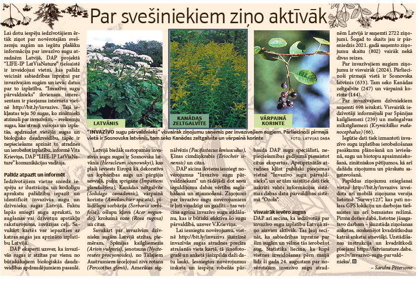 “Nereti paši cilvēki, it kā negribot neko sliktu, var nodarīt uz gadu simtiem paliekošu kaitējumu dabai,” skaidrojot situāciju ar invazīvo sugu izplatību Latvijā, saka DAP “LIFE IP LatViaNature” invazīvo sugu eksperte Santa Rutkovska.