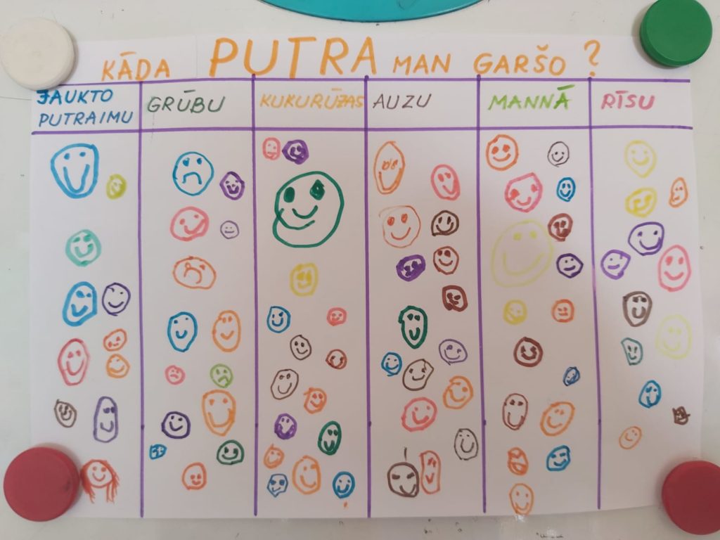 “Vairākas reizes gadā iestādē notiek pārtikas atkritumu monitorings grupās, pētot, cik daudz ēdiena palika pāri, ko bērni labprātāk ēd, ko ne. To visu ņem vērā, pilnveidojot iestādes ēdienkarti. Reizi mēnesī iestādē ir veģetārā diena. Darbinieki iesaistījušies akcijā “Neapēd zemeslodi”, katra iespēju robežās atsakoties no gaļas izstrādājumiem. Izvēlamies “Eko” trauku mazgāšanas līdzekļus, cik vien iespējams, taupām ūdeni, lai izpildītu sanitārās normas trauku mazgāšanas procesā,” stāsta A. Apine.