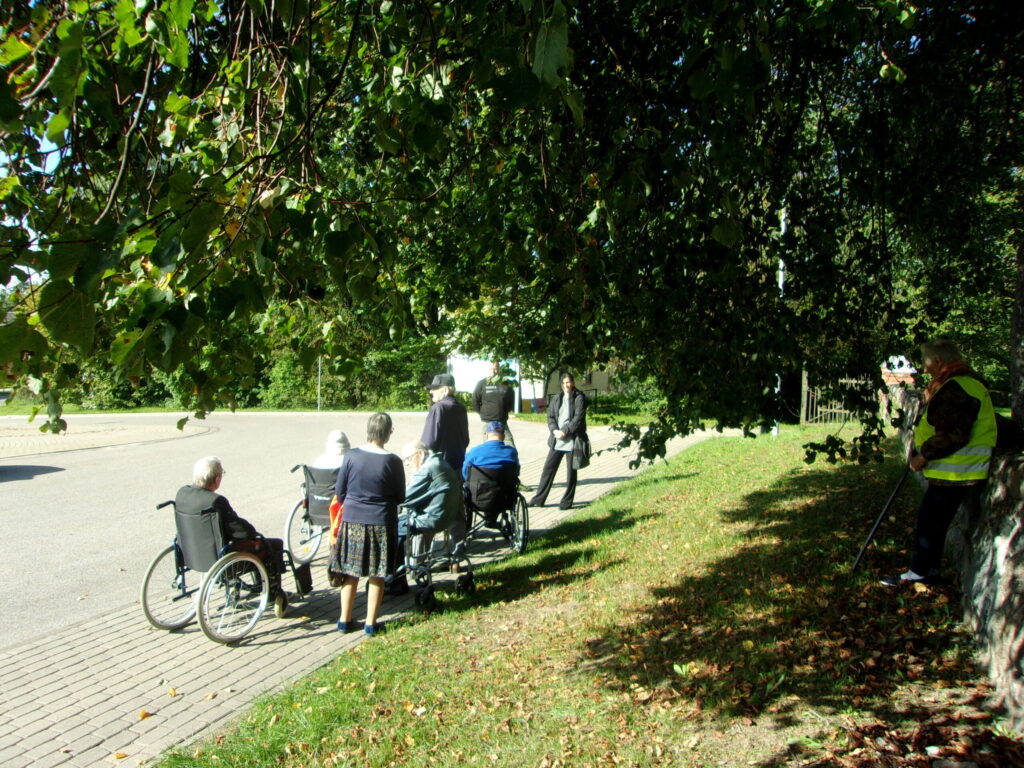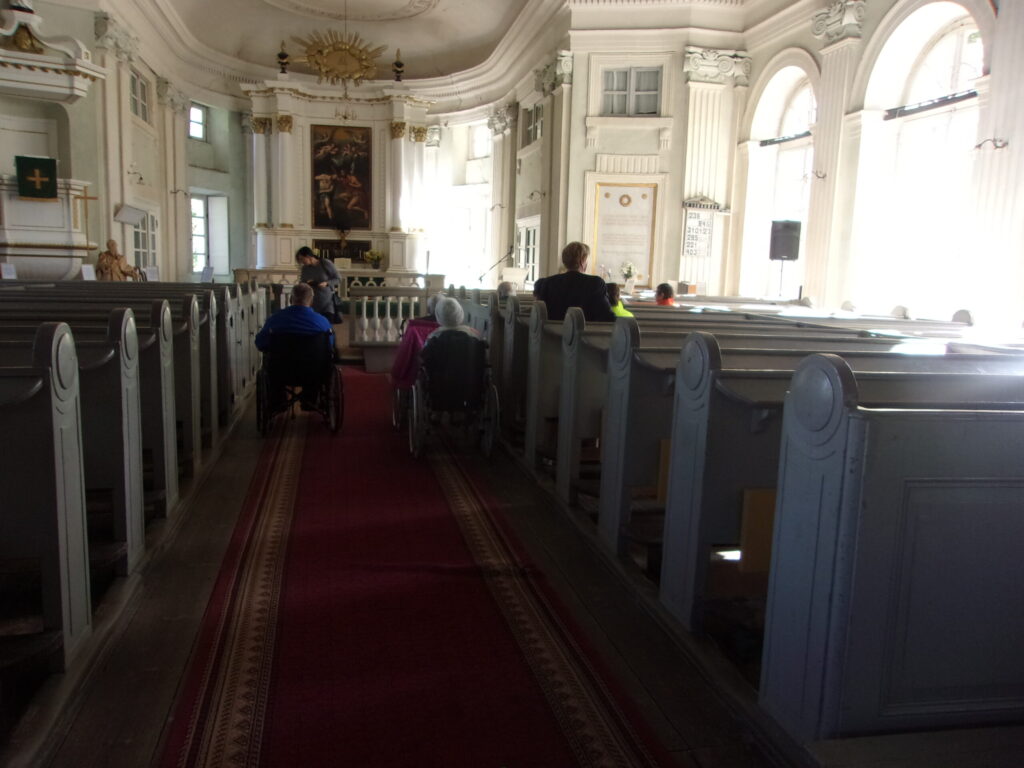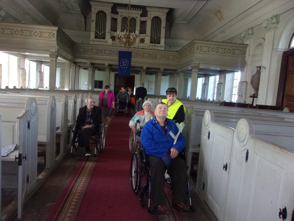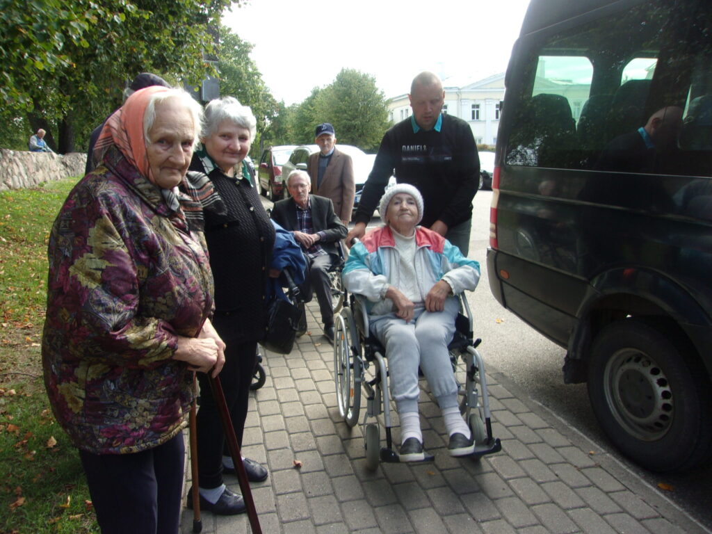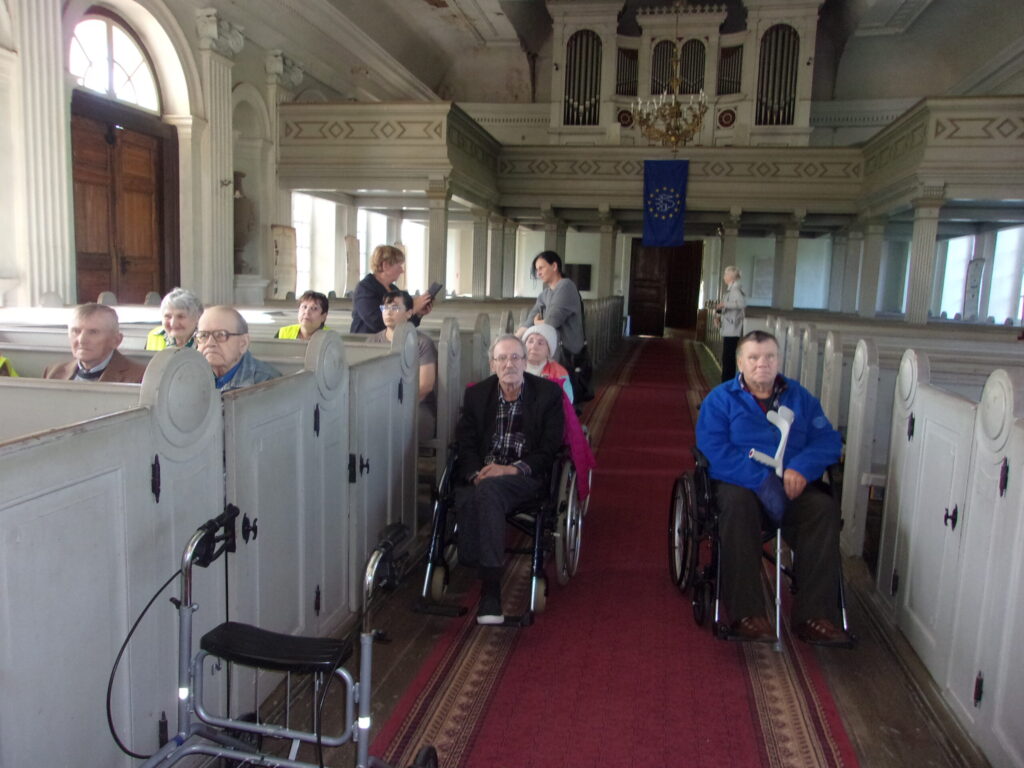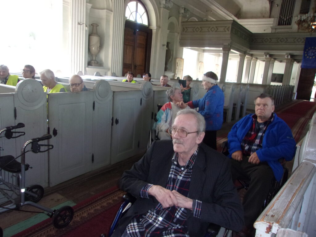 Ir astotā septembra rīts, kad vēl nezināju, ka pēc pāris minūtēm saņemšu zvanu no sociālās aprūpes centra „Pīlādži’’ vadītājas Laimas Kaņepes ar uzaicinājumu piedalīties centra rīkotajā pasākumā-Braucienam ar Severīnu pa pilsētu, tad Luterāņu baznīcas apmeklējumu, kurā dzirdēs arī ērģeļu koncertu. Tikties vajadzēja pulksten 10 un 10 minūtēs pie baznīcas. Biju ļoti patīkami pārsteigta un pateicīga par šo negaidīto piedāvājumu. Protams, ka ne mirkli nešaubījos un ar laimīgu smaidu uz lūpām gāju sagaidīt sev tik mīļos pīlādzēnus. Vispirms gan satikos ar centra bijušo darbinieku Vairi Janeku, kurš tagad strādā dažādus darbus pie baznīcas. Pats pieteicies no te no bezdarbniekiem. jo centrā samazināja štatus. Vairim te patīk un labprāt pielieto savas prasmes. (attēlā) Drīz jau arī piebrauca gaidītais pagasta autobuss ar iemītniekiem un pavadošajiem darbiniekiem. Uzteicami tas, ka atbraucīju vidū bija ne tie stiprākie, bet vairākiem bija atbalsta spieķi un daudzi sēdēja ratiņkrēslā. Visiem tika sniegta palīdzīga roka pie izkāpšanas( attēlā) Vēlāk foto tapa arī gaidot Severīnu.