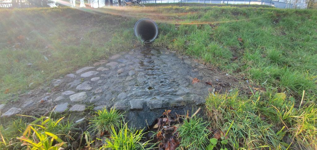 KAS IEPLŪST EZERĀ? Uz Alūksnes ezera pusi vērstā notekcaurule iepretim Nacionālo bruņoto spēku Kājnieku skolas teritorijai Alūksnē. Foto: Loreta Jargane