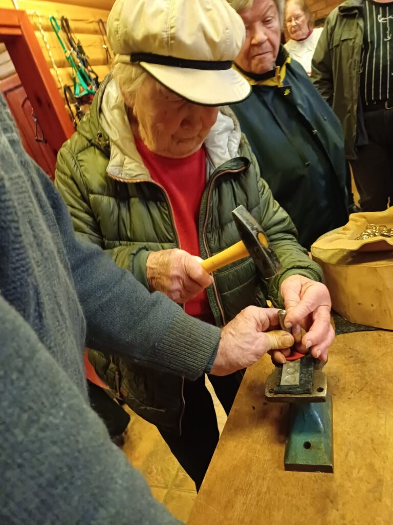 Tuvojoties tumsai, mazliet kavējāmies, taču ļoti vēlējāmies paspēt uz ādas apstrādes meistarklasi. Mūs sirsnīgi sagaidīja saimniece Irēna, rokās turot palielu gaismas lukturīti, un uzmundrināja mūs. Dodamies plašajā, siltajā, mājīgajā “Apkalnmājā”, kas ir vienīgā vieta Latvijā, kur gatavo zirglietas. Šeit top arī somas, somiņas, maki, siksnas. Produkcija ir skaisti noformēta, estētiski baudāma. Saimnieku vadībā gatavojām atslēgu piekariņus – darbs bija aizraujošs un radošs. Nācās arī mazliet padarboties ar āmuru, taču visu caurvija smiekli, labestīgas emocijas un brīnišķīgs miers dvēselei. Priecēja arī tas, ka mūsu šoferītis Ģirts bija kopā ar mums, mēs visi bijām vienoti. Paldies visiem!