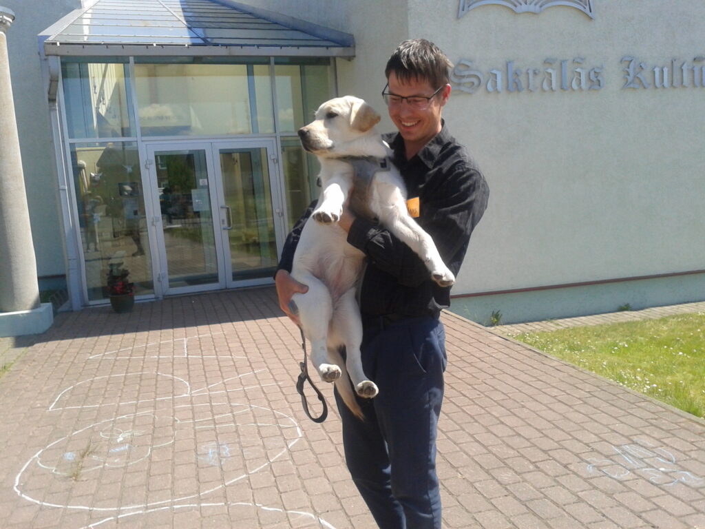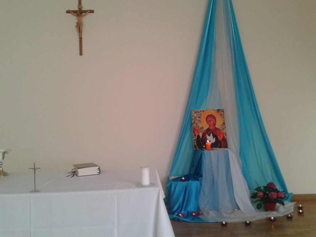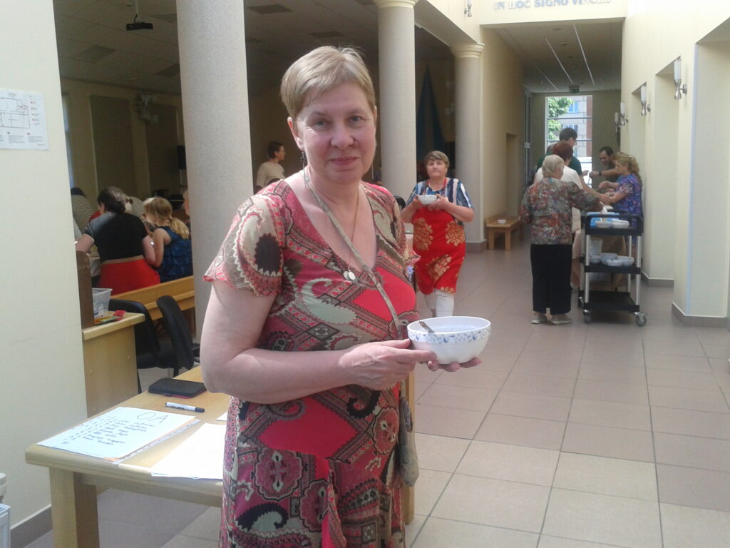 Kad jau esmu gana staigājusi un foto kamerā ir pietiekami daudz bilžu, dodos uz Sakrālo centru, kas bija arī galvenais mans brauciena mērķis. Pa centra durvīm nāk pretī jauns vīrietis ar suni, iepazīstamies. Saucot par Jāni un tā esot suņu dāma Dora un paņem klēpī, tā arī top foto. Jānis stāsta, ka esot centra darbinieks un aicina iet tālāk – tur mani sagaida centra darbiniece, pasākumu organizētāja Rita ar bļodiņu rokā. Arī man laipni piedāvā pusdienas, neatsakos, zupa garšīga. Pie galda jau daudz apmeklētāju, visi sanākuši uz Marijas skolas nodarbību – tur apgūst kristīgo evaņģelizāciju, Ritai ir arī muzikālā izglītība, strādā Balvu mūzikas skolā. Brīdi pakavējos, tad aizeju līdz altārim ,kur ir redzams Dieva Mātes Marijas attēls. Tur arī saņemu gandarījumu palūdzoties un lūdzot piedošanu. Tad arī laiks doties uz autoostu, diena ir izdevusies jo esmu saņēmusi to, kāpēc es braucu uz Balviem un apmeklēju Sakrālo centru.