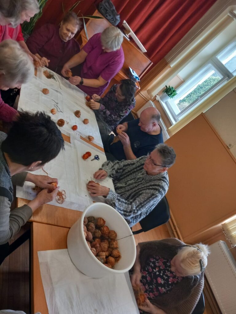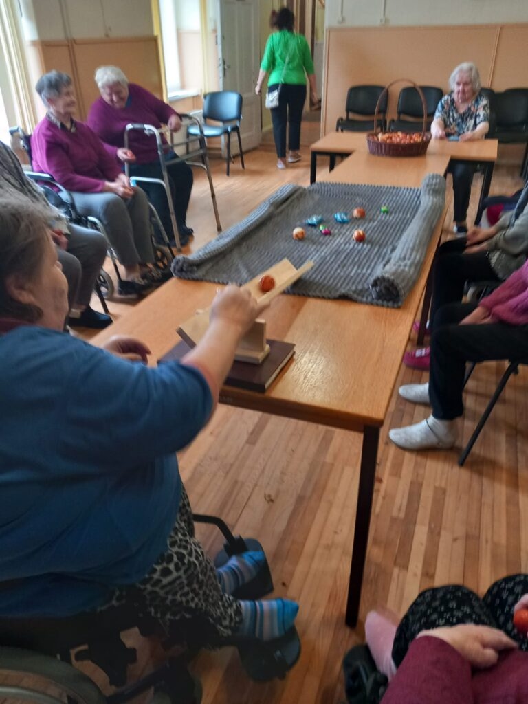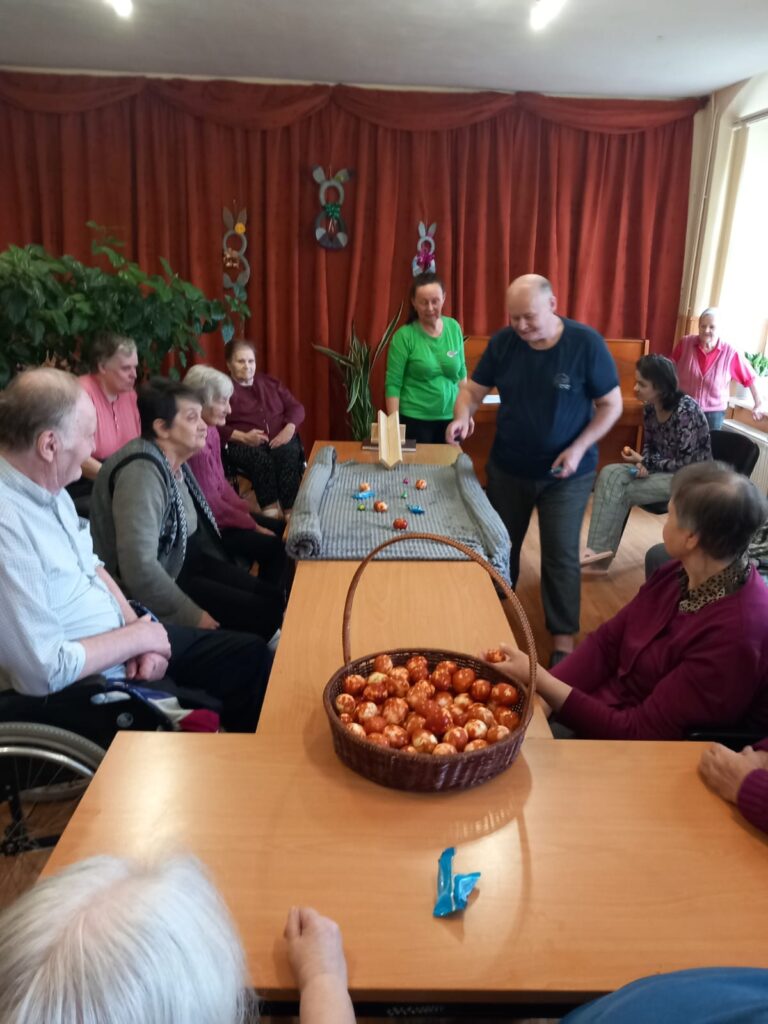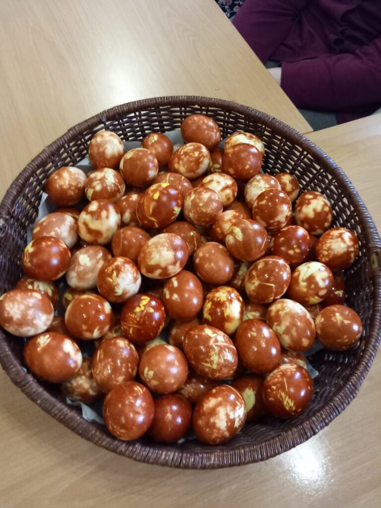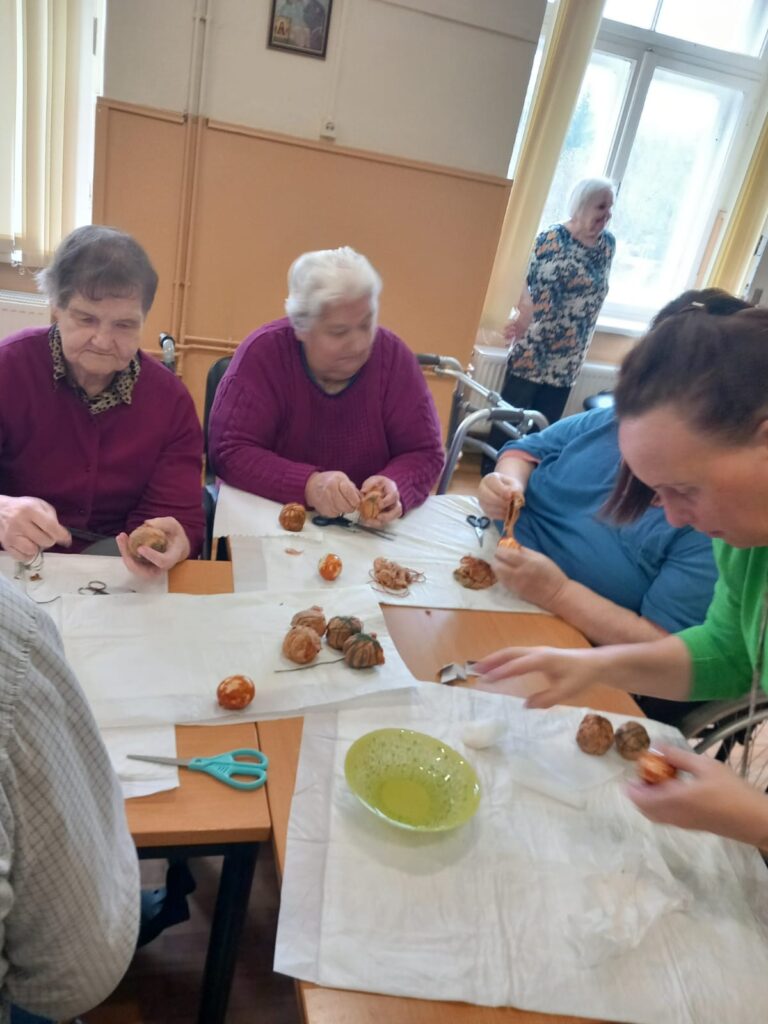16.aprīlī SAC “Alūksne” iemītnieki pie lielā saimes galda cītīgi krāsoja olas, izmantojot dažādus dabas materiālus – pavasara puķes, zaļumus, sīpolu mizas un putraimus.