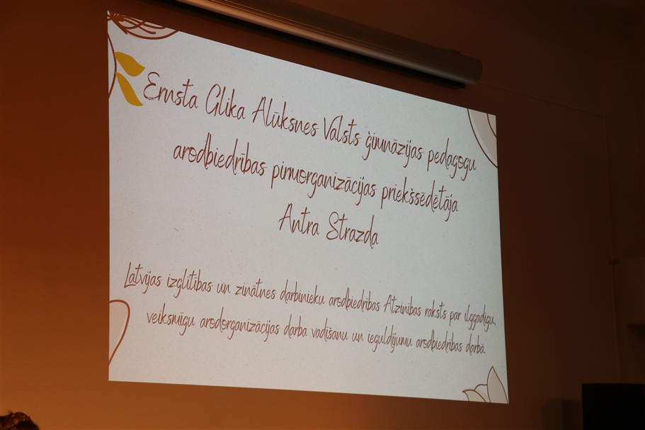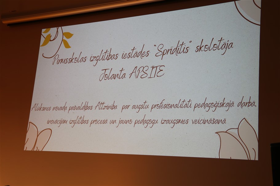 Skolotāju dienas priekšvakarā, 2. oktobrī, Ernsta Glika Alūksnes Valsts ģimnāzijā notika svinīgs pasākums, kurā par ieguldīto darbu un mīlestību jaunās paaudzes izglītošanā godināja skolotājus. Alūksnes novada pašvaldības un Izglītības un zinātnes ministrijas Atzinības rakstus, sveicienus no saviem audzēkņiem un kolēģiem šajā dienā saņēma vairāki no viņiem – Ernsta Glika Alūksnes Valsts ģimnāzijas skolotājas Mārīte Palma, Sandija Danenberga, Iveta Mikijanska un skolas pedagogu arodbiedrības pirmorganizācijas priekšsēdētāja Antra Strazda, Ziemeru pamatskolas skolotāja Ziedīte Aigare, pirmsskolas izglītības iestādes “Sprīdītis” skolotāja Jolanta Apsīte, pirmsskolas izglītības iestādes “Pienenīte” skolotāja Ilze Strupkāja, un Alūksnes Bērnu un jauniešu centra skolotāja Ina Perevertailo. “Jūs dodat vairāk kā zināšanas, jūs iedrošināt, jūs iedvesmojat, uzklausāt un palīdzat augt. Katrs labs vārds, katrs paskaidrojums, katra ticība skolēnam ir ieguldījums nākotnē. Paldies par to, ka jūs vienmēr esat līdzās gan priekos, gan brīžos, kad ir grūti, paldies par to, ka jūs spējat redzēt potenciālu tur, kur citi vēl to nesaskata. Lai Skolotāju diena jums ir silta, pateicības pilna un jums ļoti pelnīta,” uzrunājot novada skolotājus, teica sarīkojuma vadītāja Egija Silāre.