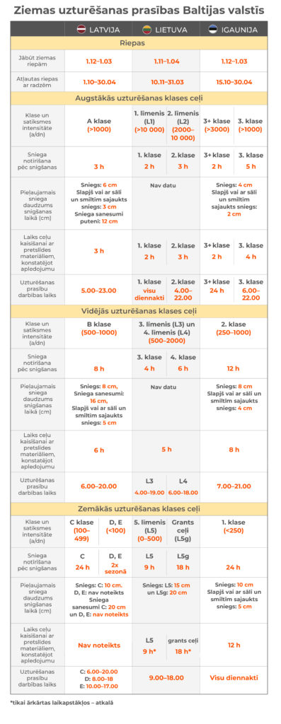 Valsts autoceļiem ziemas sezonā atbilstoši MK noteikumiem noteiktas piecas uzturēšanas klases – A, B, C, D un E. Detalizētas prasības par uzturēšanu atbilstoši klasēm skatiet tabulā pielikumā (uzturēšanas prasības salīdzinātas arī ar prasībām kaimiņvalstīs Lietuvā un Igaunijā).