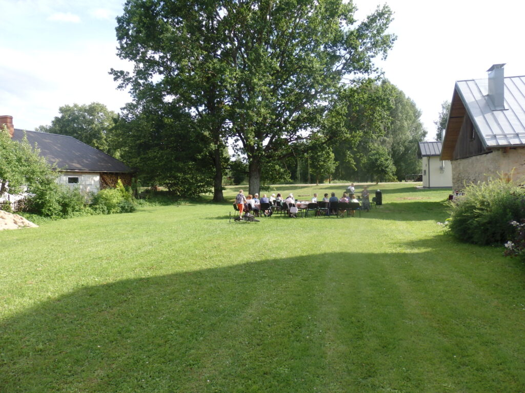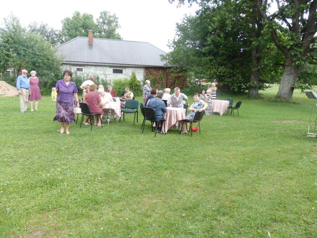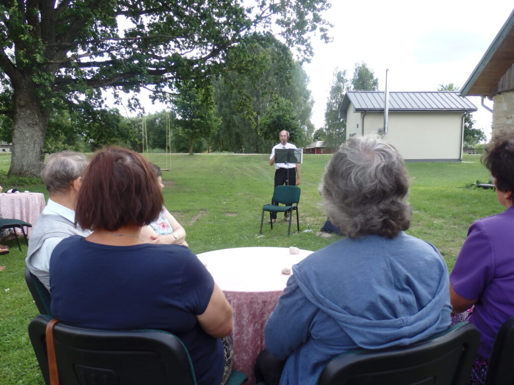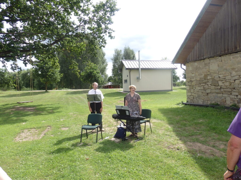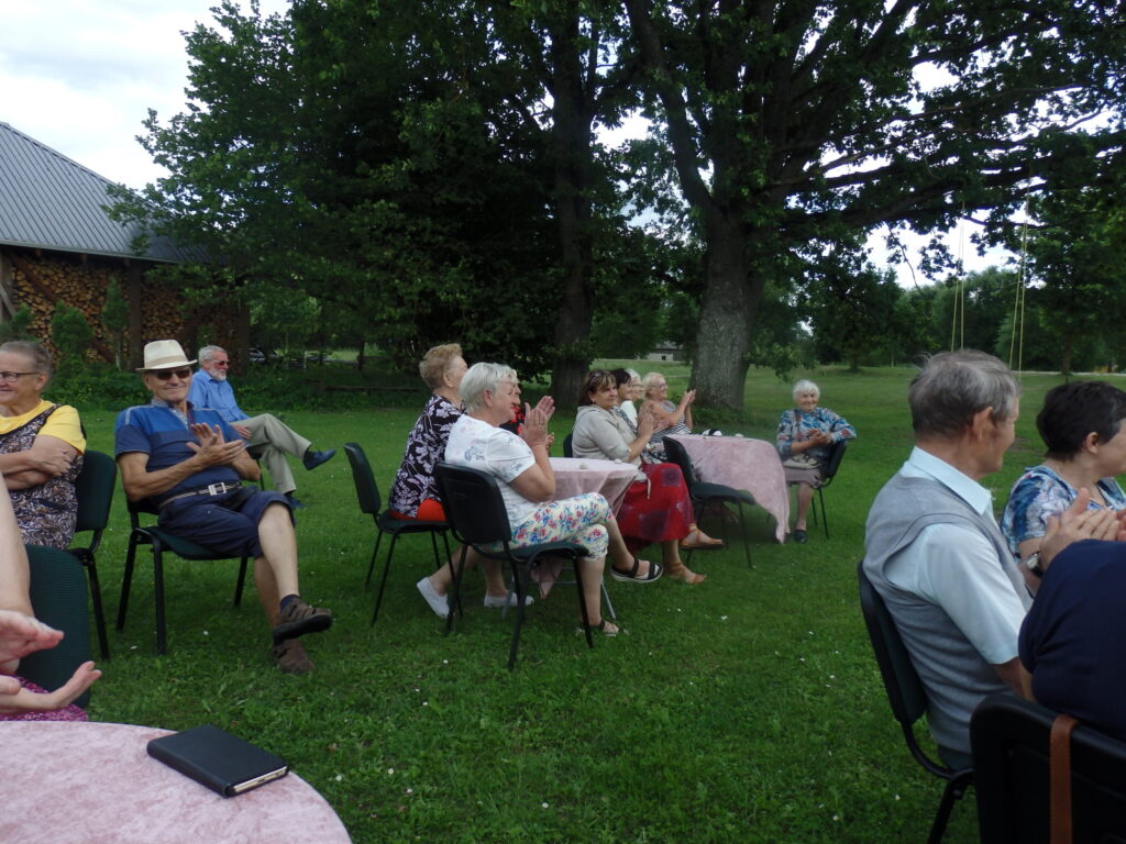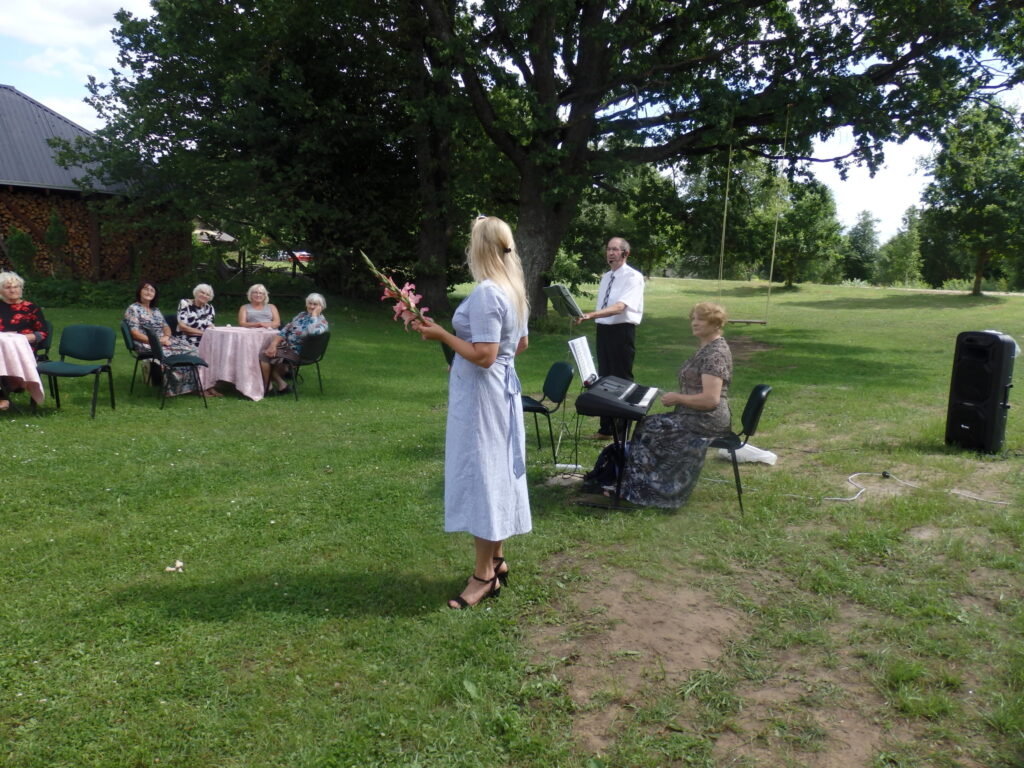 Tur es viesojos saulainajā 22. Jūlija pēcpusdienā kopā ar Sarmīti un Andri Eliasiem. Viesošanās iemesls- Apes „Namiņa’’ dalībnieku saiets pēc pusotra gada ilgas netikšanās, kur pandēmijas pēc visi pasākumi tika atlikti. Šī diena bija arī pilsētas pensionāru „Namiņa’’ vadītājas Dzintras Ozoliņas jubilejas diena. Viņu un pārējos dalībniekus Sarmīte un Andris sagaidīja ar dziesmu. Pirms godināšanas jubilāre lūdza ar klusuma brīdi pieminēt tos, kuru vairs nav viņu vidū. Tad par godu jubilārei un priecīgajam notikumam, ka atkal visi var būt kopā, šoreiz ārā zem ozola, Sarmīte ar Andri sniedza stundu garu koncertu. Visas dziesmas nenosaukšu- skanēja dziesmas no teātra izrādēm, arī citas, bet īpaši jubilārei sveikšanas reizē tika dziedāta dziesma ,,Rozes’’, bet pašā noslēgumā trīs dziesmas tika veltītas dvēselei un Dievam. Kad sāka dziedāt ,,Aleluja’’, tad pati biju lieciniece, kad tajā brīdī pieklusa vējš un pat lapas ozolā nekustējās. Tad es sapratu, ka Dieva stūris ir Ape.