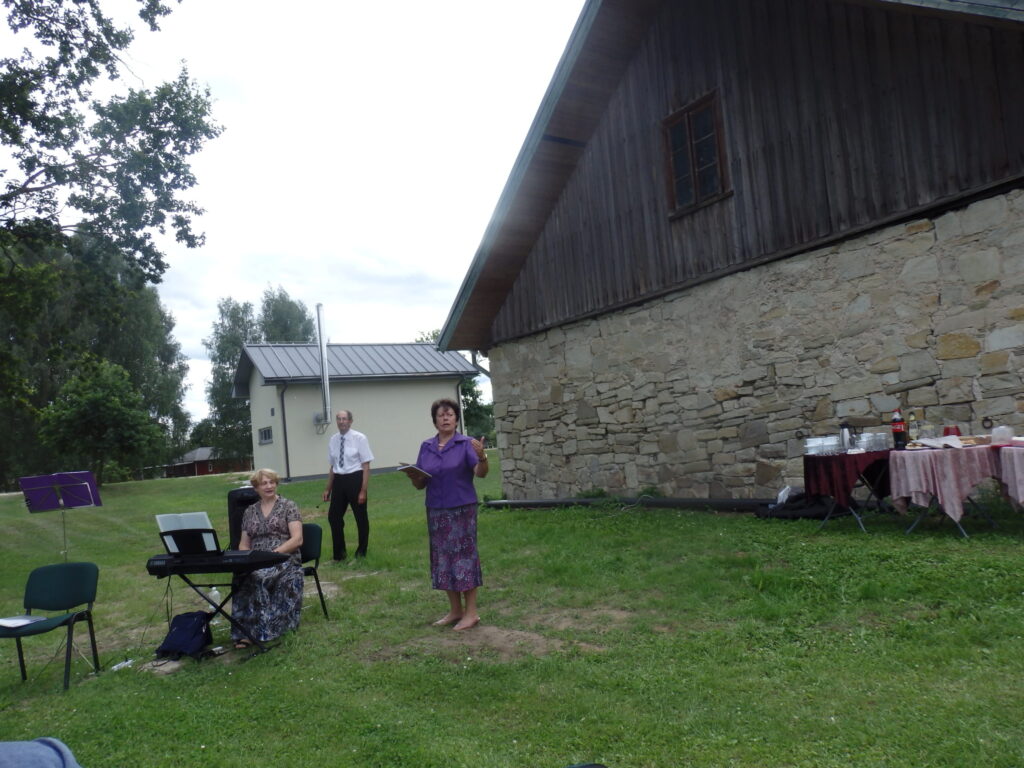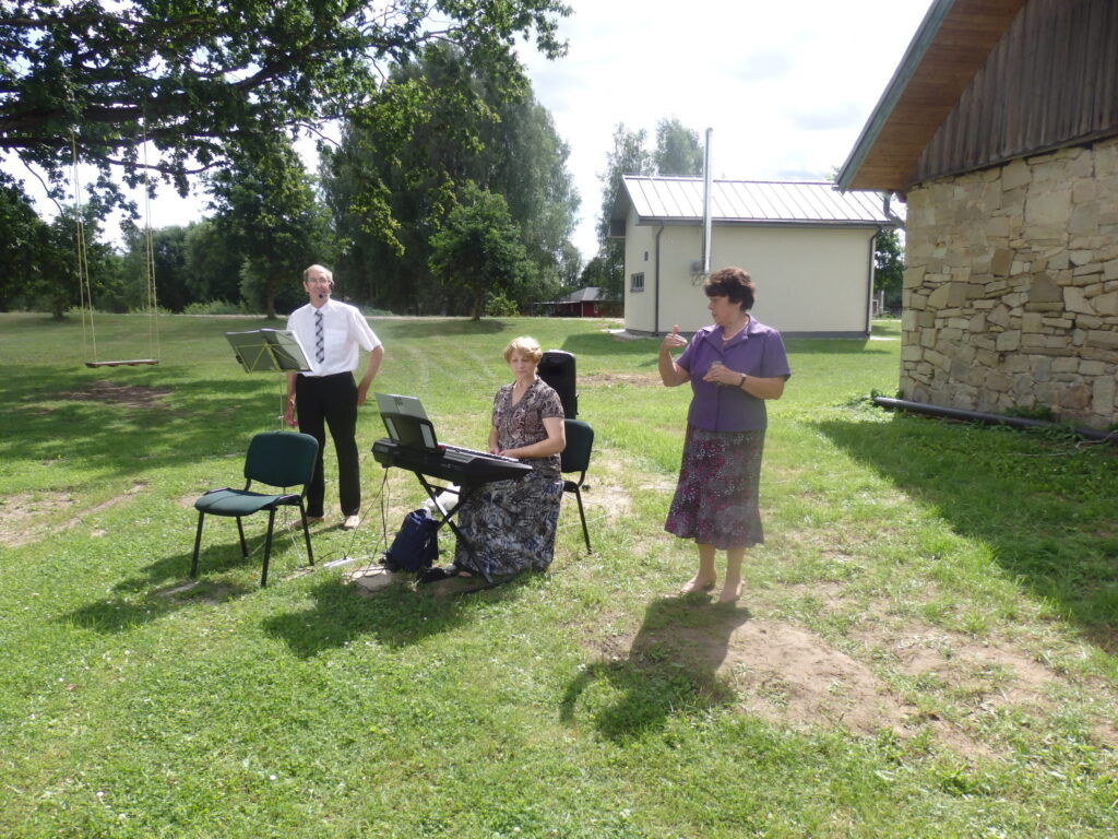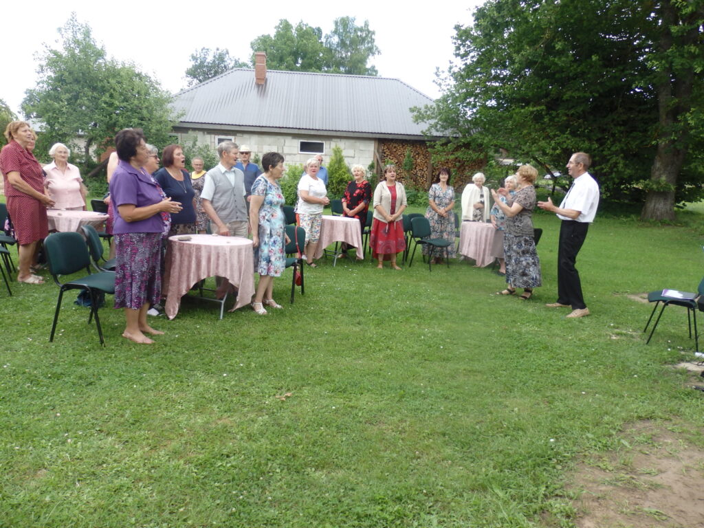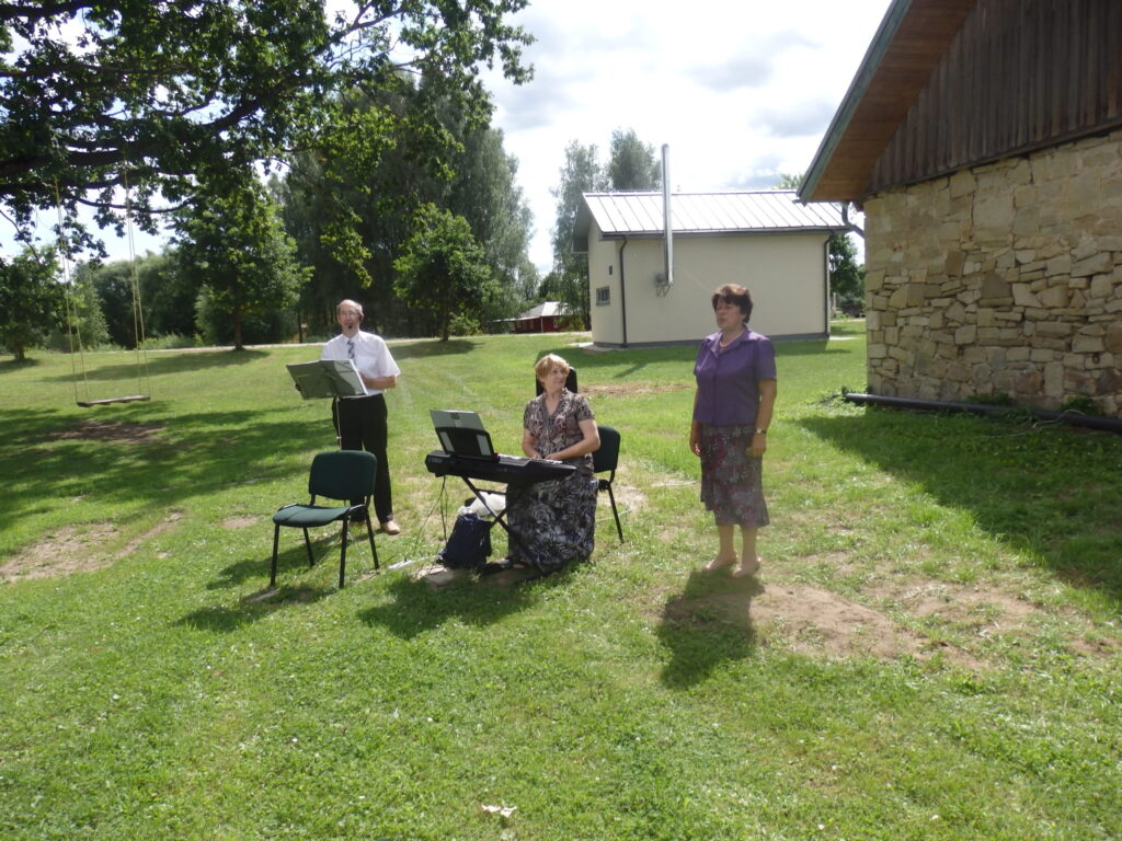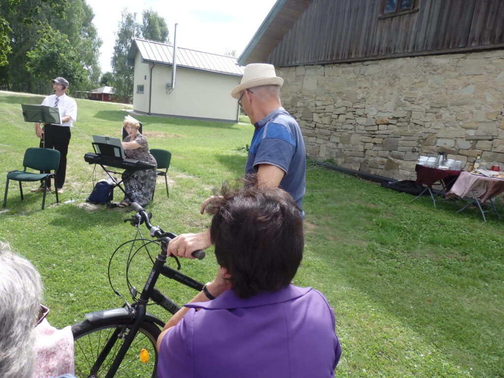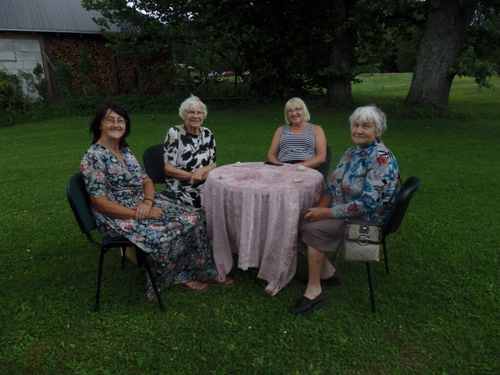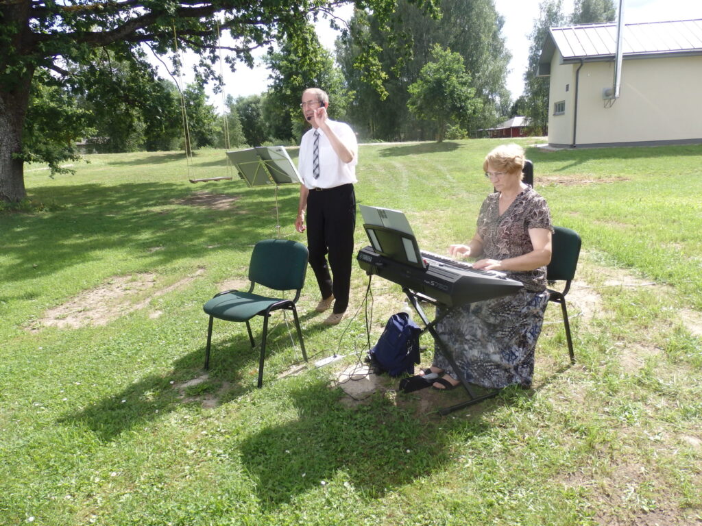 Tur es viesojos saulainajā 22. Jūlija pēcpusdienā kopā ar Sarmīti un Andri Eliasiem. Viesošanās iemesls- Apes „Namiņa’’ dalībnieku saiets pēc pusotra gada ilgas netikšanās, kur pandēmijas pēc visi pasākumi tika atlikti. Šī diena bija arī pilsētas pensionāru „Namiņa’’ vadītājas Dzintras Ozoliņas jubilejas diena. Viņu un pārējos dalībniekus Sarmīte un Andris sagaidīja ar dziesmu. Pirms godināšanas jubilāre lūdza ar klusuma brīdi pieminēt tos, kuru vairs nav viņu vidū. Tad par godu jubilārei un priecīgajam notikumam, ka atkal visi var būt kopā, šoreiz ārā zem ozola, Sarmīte ar Andri sniedza stundu garu koncertu. Visas dziesmas nenosaukšu- skanēja dziesmas no teātra izrādēm, arī citas, bet īpaši jubilārei sveikšanas reizē tika dziedāta dziesma ,,Rozes’’, bet pašā noslēgumā trīs dziesmas tika veltītas dvēselei un Dievam. Kad sāka dziedāt ,,Aleluja’’, tad pati biju lieciniece, kad tajā brīdī pieklusa vējš un pat lapas ozolā nekustējās. Tad es sapratu, ka Dieva stūris ir Ape.