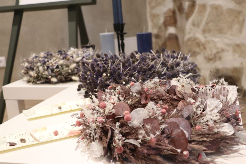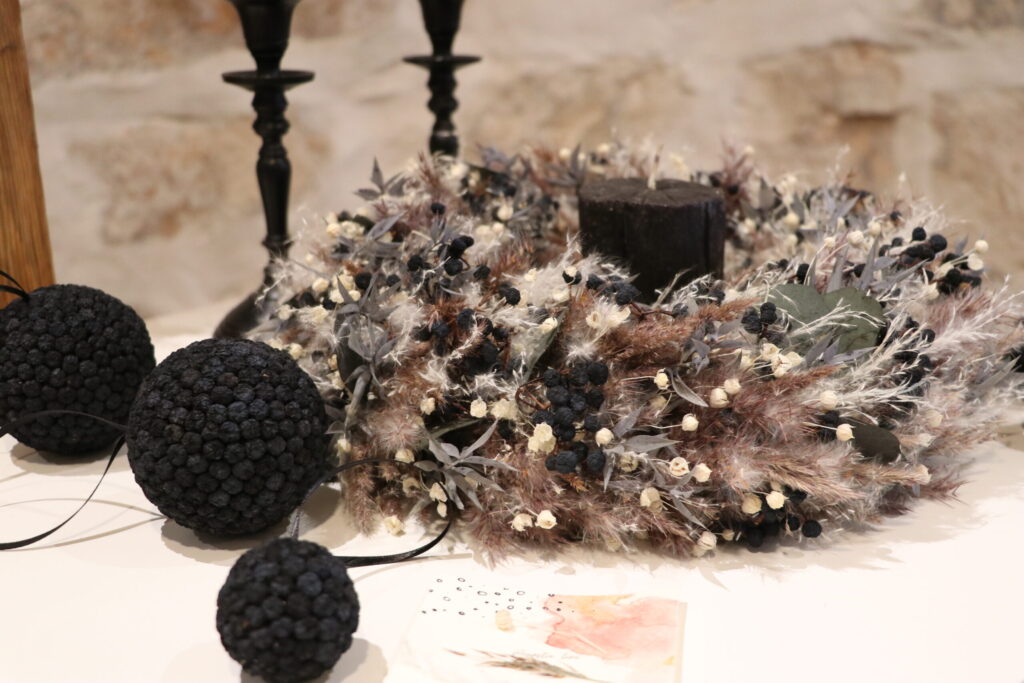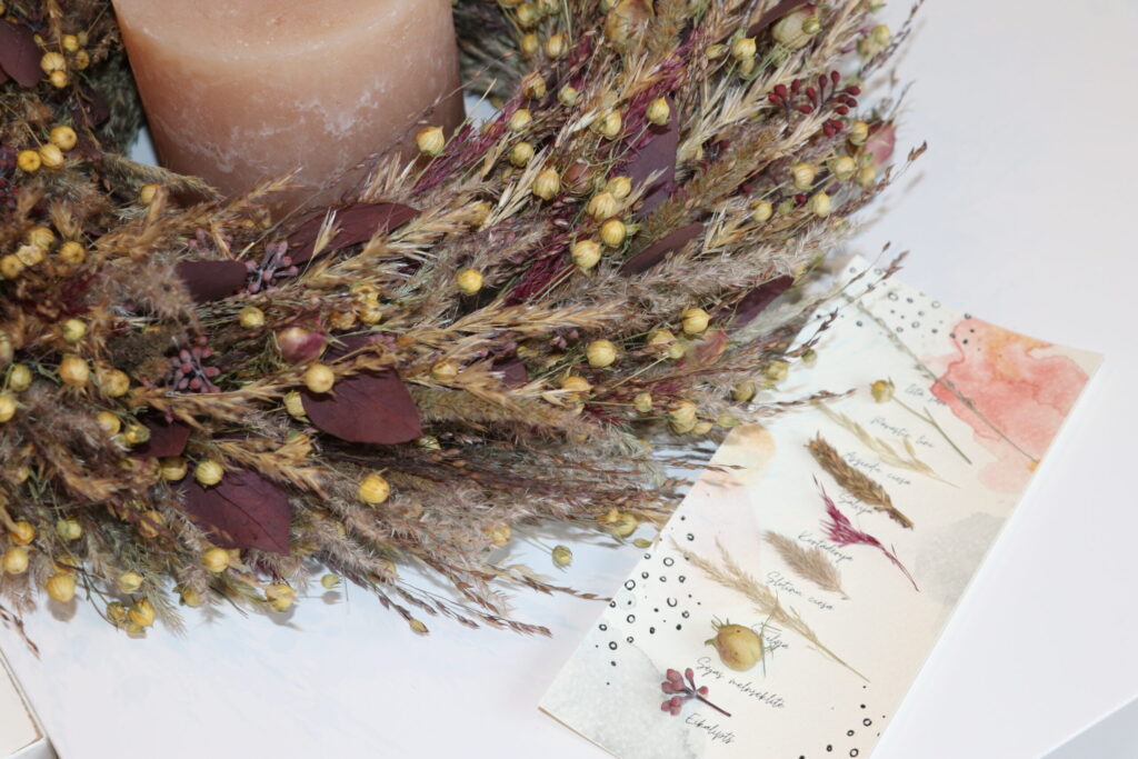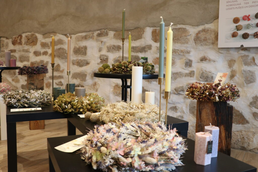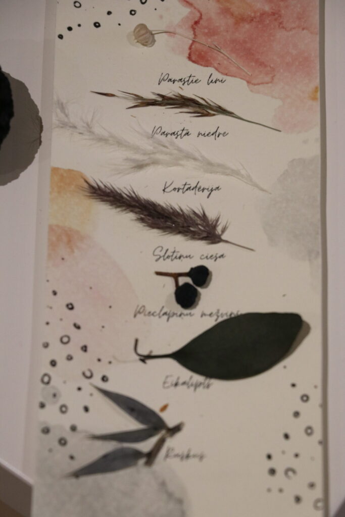Smilgas, ziedi, odziņas, čiekuriņi – ikviens materiāls izraudzīts dabā, ievākts un apčubināts, vēlāk neskaitāmas reizes piemērīts, komplektēts ar kādu košumiņu, cenšoties atrast saskaņu un radīt īsto noskaņu. Tīrs roku darbs.