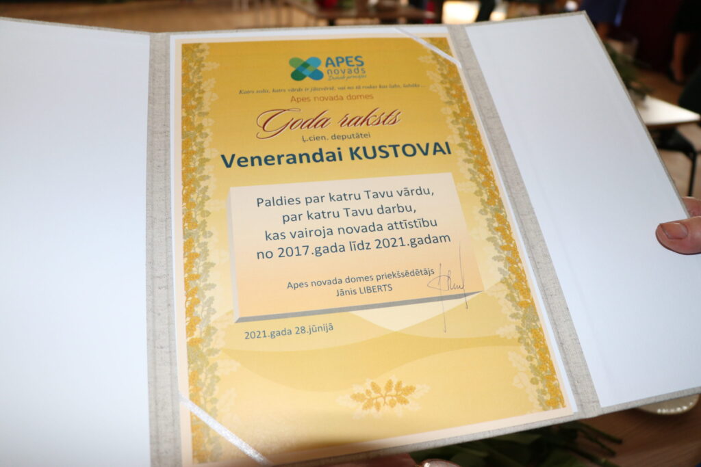 Pēdējā domes sēdē deputāti pieņēma 16 lēmumus. Vēl pirms sēdes sākuma Apes novada iestāžu vadītāji bija sagatavojuši pārsteigumu deputātiem – skanēja dziesmas, dāvāja ziedus un teica paldies vārdus. “Visi kopā esam krietni pastrādājuši. Vai varēja labāk? Ir savi plusi un savi mīnusi. Paldies visiem iestāžu darbiniekiem. Beidz pastāvēt novads, bet vieta kā tāda paliek un turpina strādāt,” sēdē teica domes priekšsēdētājs Jānis Liberts.