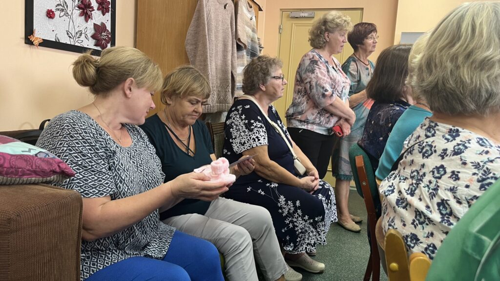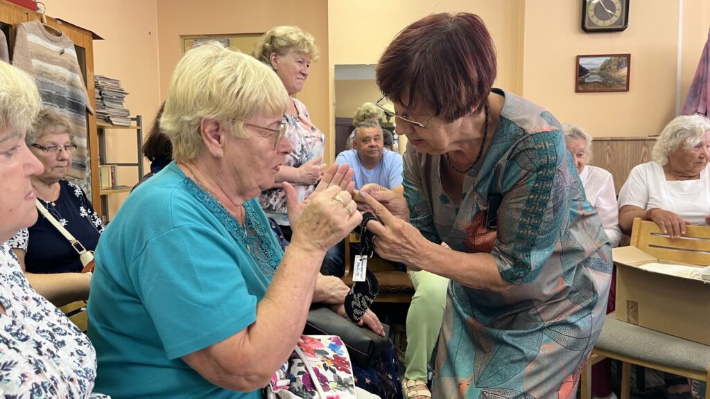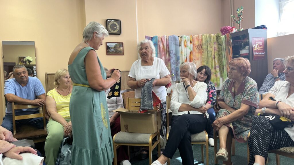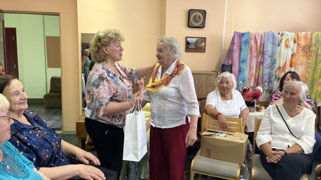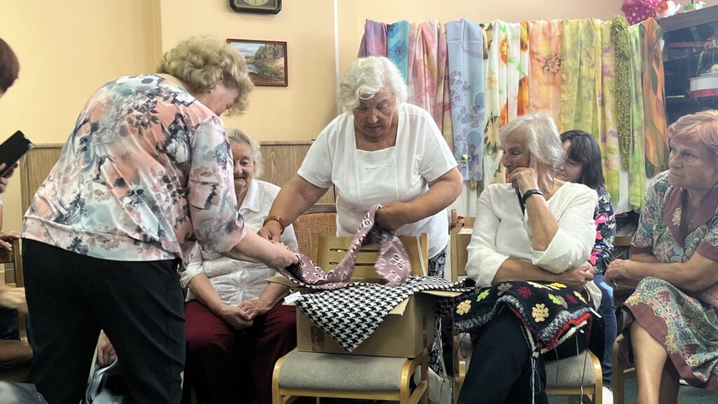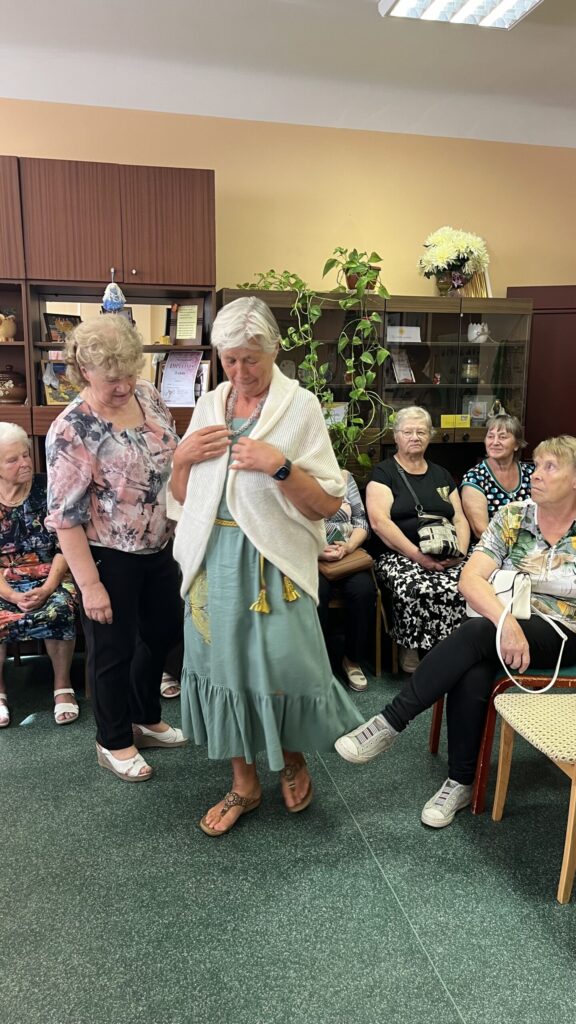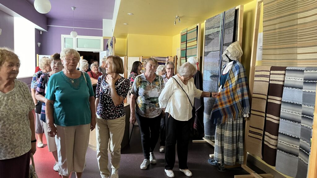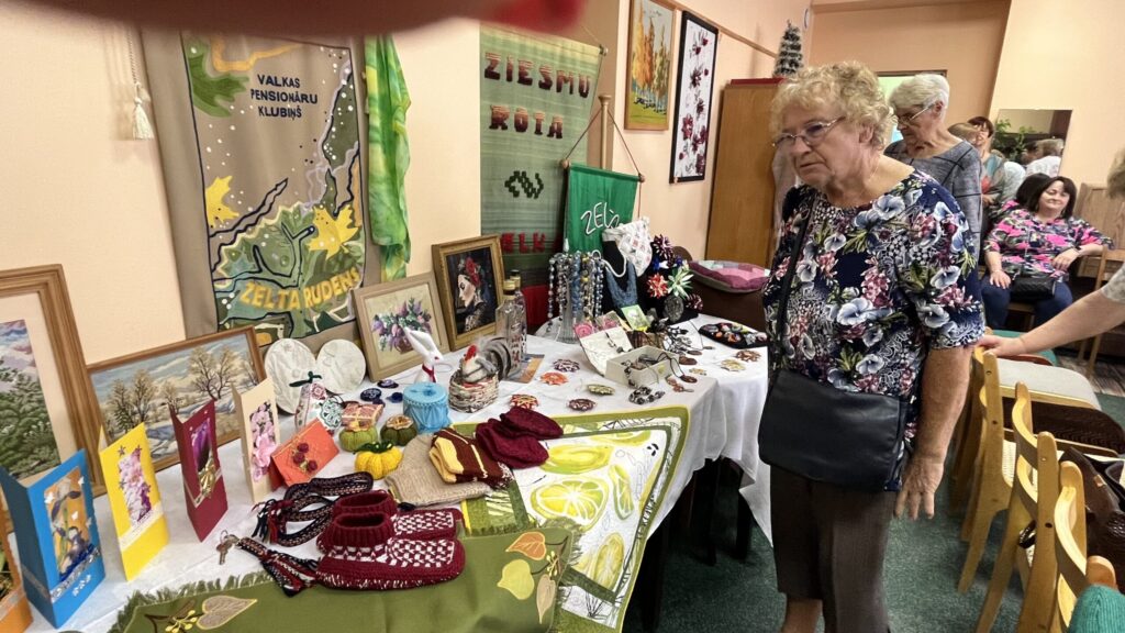 Biedrība “Pensionāru klubs “Zelta rudens”” Valkā pastāv jau 22. gadu. Viņu mērķis, tāpat kā Alūksnes senioriem, ir veicināt vecākās paaudzes iesaistīšanos dažādās aktivitātēs, piedaloties mākslinieciskajos kolektīvos un būt līdzdalīgiem kultūras un citās sabiedriskajās norisēs, sadarbībā ar pašvaldību un citām nevalstiskajām organizācijām. Valcēnieši ar biedrības vadītāju Zaigu Purni priekšgalā todien alūksniešiem ļoti laipni izrādīja savas telpas. Vispirms ekskursija pa Kultūras namu, kuram pamatakmens likts 1924. gadā. Nams veidots neoeklektisma stilā un ir viens no 1920. – 30. gadu izcilākajiem sabiedrisko celtņu piemēriem Ziemeļvidzemē. No tā logiem un balkona paveras brīnišķīgs skats uz Lugažu laukumu un tur esošo strūklaku, kas augusta saulē vizuļoja īpaši koši. Valcēniešu “Zelta rudens” dejo, dzied un, vingrinot pirkstus, ir lielas rokdarbnieces. Dejotāji un dziedātāji jau redzēti senioru svētkos, bet rokdarbnieces todien laipni izrādīja savus darbus. Rokdarbnieču pulciņš gan nav liels, tikai septiņas seniores, bet ļoti darbīgs. Viņas ada, tamborē, pērļo, krustdūrienā izšuj glezniņas, gatavo kartītes, batiko un krāso zīda šallītes, darina piespraudes, medaljonus un daudz ko citu. “Visu, ko kāda no mums iemācās, nodod tālāk mums pārējām, un mēs to visu izmēģinām. Bet tie nav tikai rokdarbi, sanākam kopā, lai īsinātu laiku, lai pārrunātu savu ikdienu, dalītos tajā ar citām,” saka rokdarbnieču pārstāve Maija Puķīte un izrāda brīnišķīgos darinājumus.
