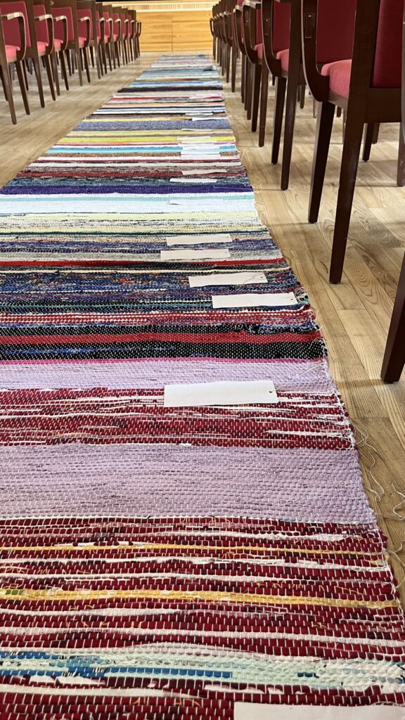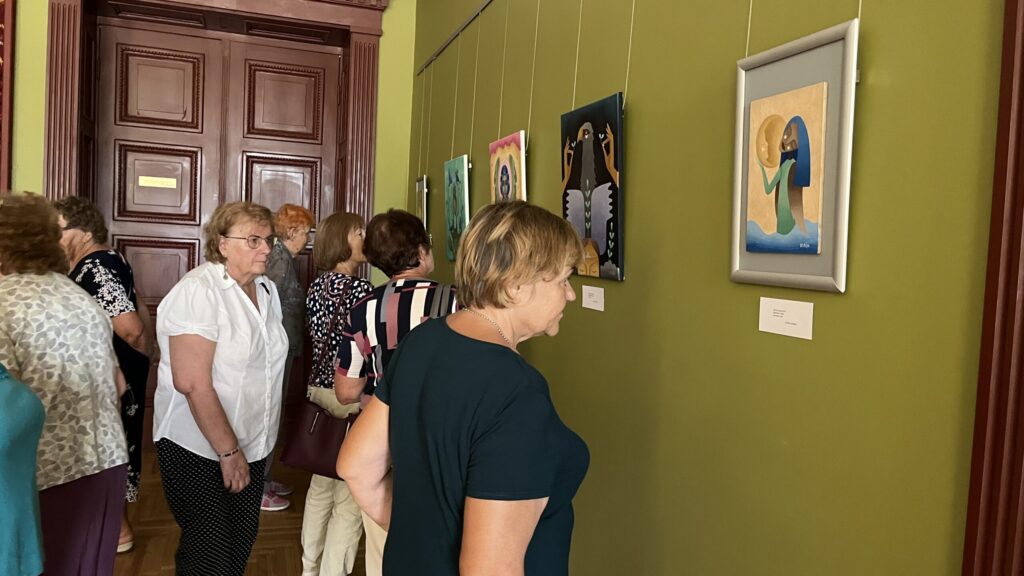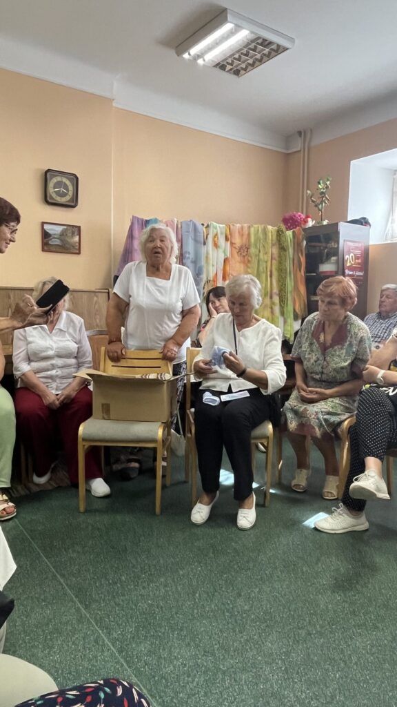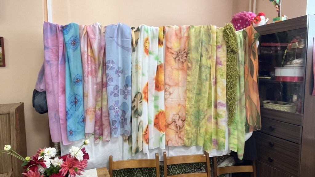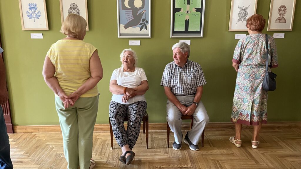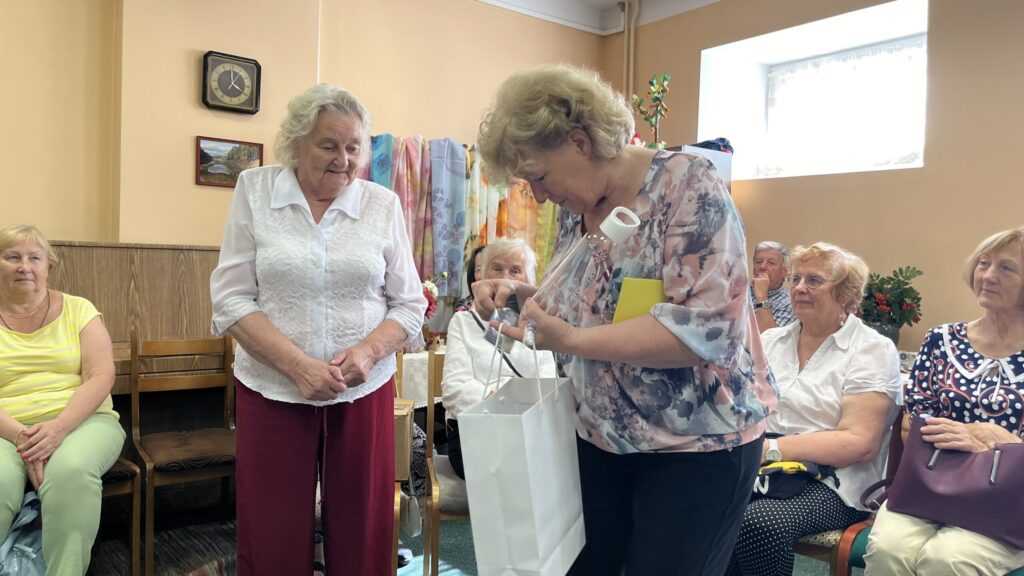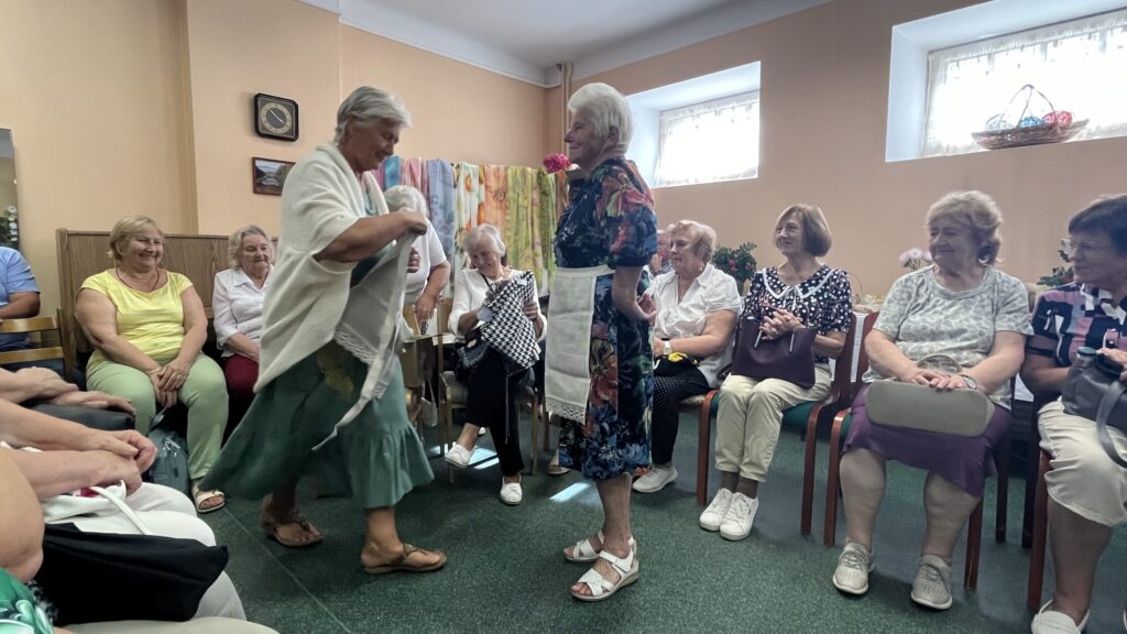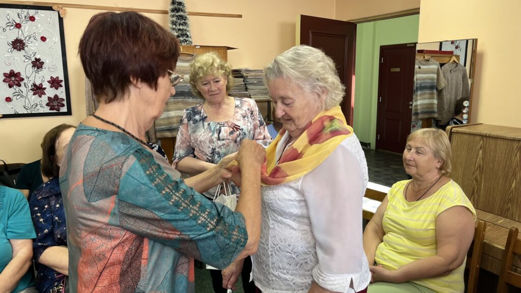 Biedrība “Pensionāru klubs “Zelta rudens”” Valkā pastāv jau 22. gadu. Viņu mērķis, tāpat kā Alūksnes senioriem, ir veicināt vecākās paaudzes iesaistīšanos dažādās aktivitātēs, piedaloties mākslinieciskajos kolektīvos un būt līdzdalīgiem kultūras un citās sabiedriskajās norisēs, sadarbībā ar pašvaldību un citām nevalstiskajām organizācijām. Valcēnieši ar biedrības vadītāju Zaigu Purni priekšgalā todien alūksniešiem ļoti laipni izrādīja savas telpas. Vispirms ekskursija pa Kultūras namu, kuram pamatakmens likts 1924. gadā. Nams veidots neoeklektisma stilā un ir viens no 1920. – 30. gadu izcilākajiem sabiedrisko celtņu piemēriem Ziemeļvidzemē. No tā logiem un balkona paveras brīnišķīgs skats uz Lugažu laukumu un tur esošo strūklaku, kas augusta saulē vizuļoja īpaši koši. Valcēniešu “Zelta rudens” dejo, dzied un, vingrinot pirkstus, ir lielas rokdarbnieces. Dejotāji un dziedātāji jau redzēti senioru svētkos, bet rokdarbnieces todien laipni izrādīja savus darbus. Rokdarbnieču pulciņš gan nav liels, tikai septiņas seniores, bet ļoti darbīgs. Viņas ada, tamborē, pērļo, krustdūrienā izšuj glezniņas, gatavo kartītes, batiko un krāso zīda šallītes, darina piespraudes, medaljonus un daudz ko citu. “Visu, ko kāda no mums iemācās, nodod tālāk mums pārējām, un mēs to visu izmēģinām. Bet tie nav tikai rokdarbi, sanākam kopā, lai īsinātu laiku, lai pārrunātu savu ikdienu, dalītos tajā ar citām,” saka rokdarbnieču pārstāve Maija Puķīte un izrāda brīnišķīgos darinājumus.