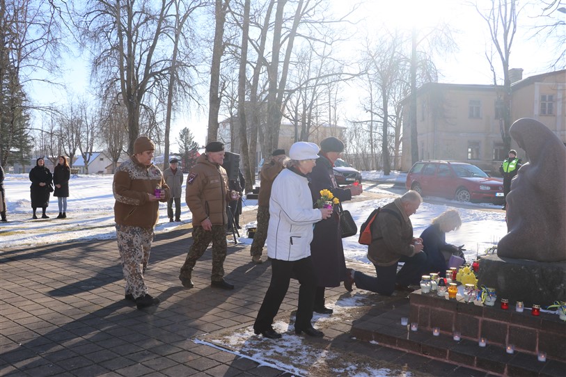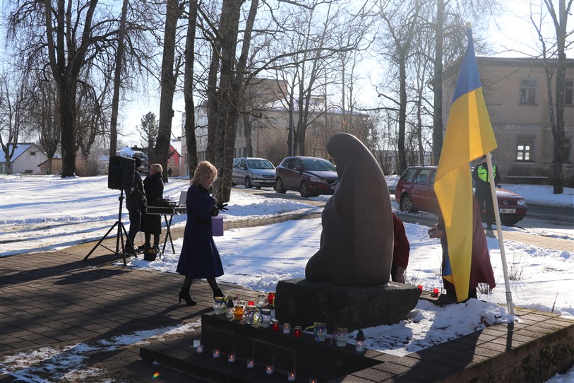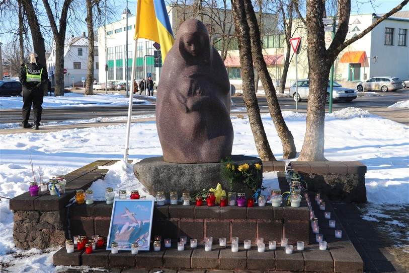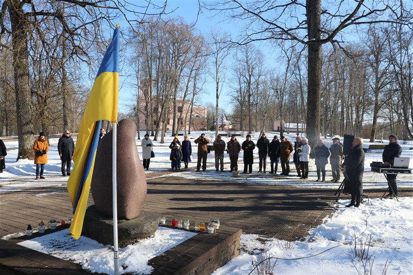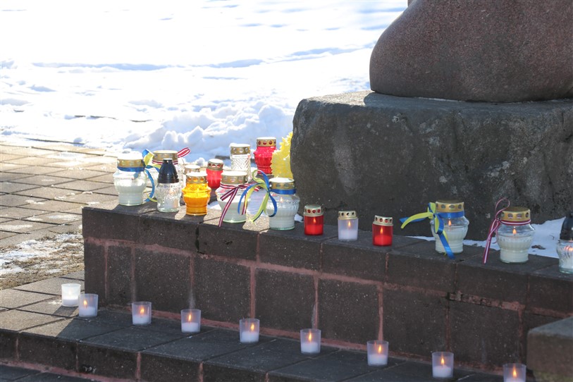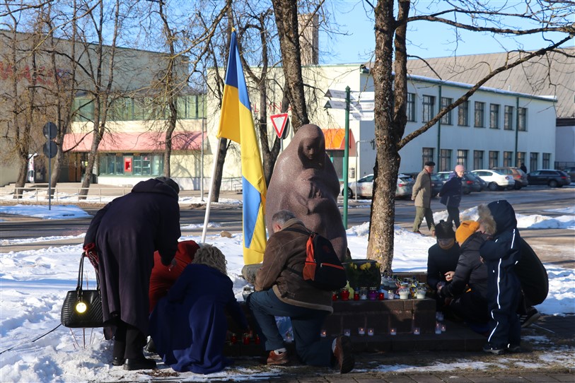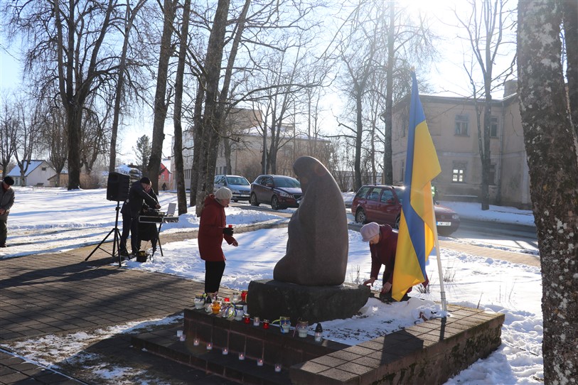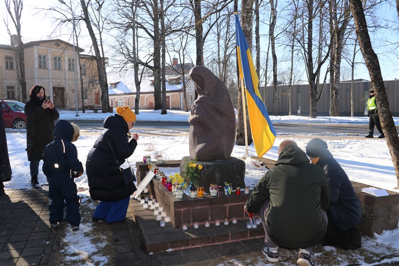 Pie Mātes tēla pulcējās kā alūksnieši, tā ukraiņi. Ikviens nolika svecīti kā atbalsta simbolu Ukrainai – 24. februārī apritējis jau trešais gads, kopš agresorvalsts iebrukuma.
