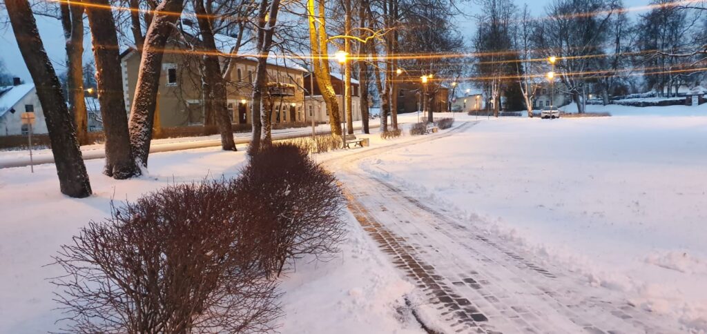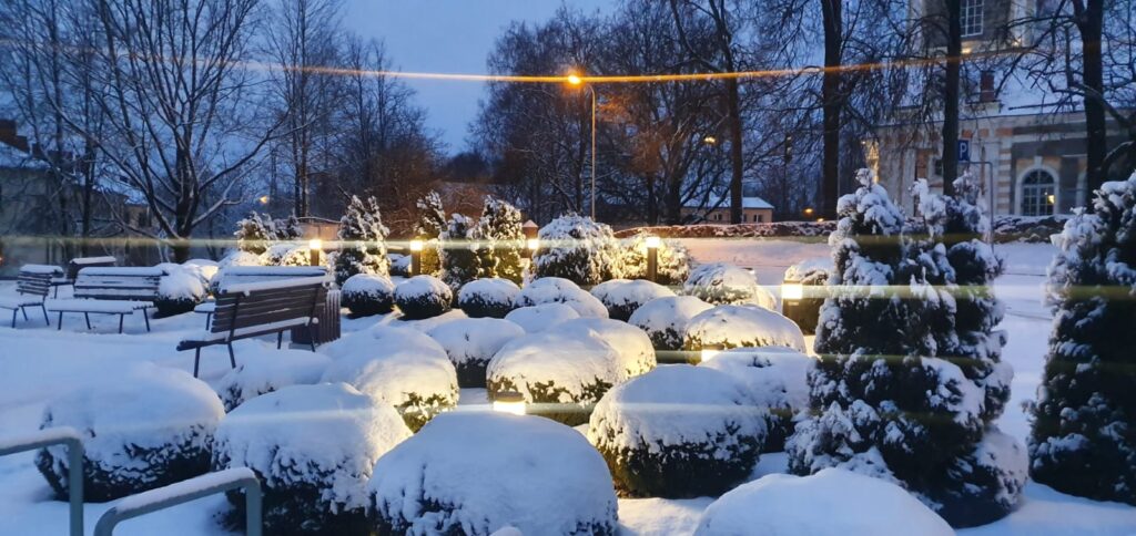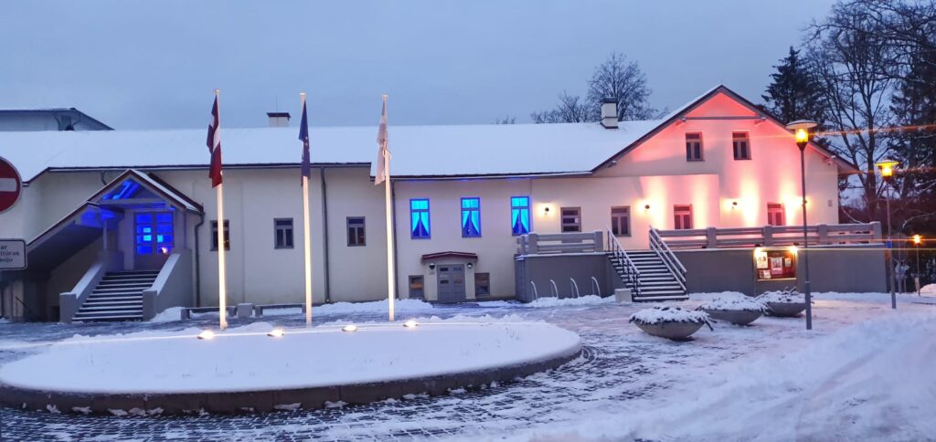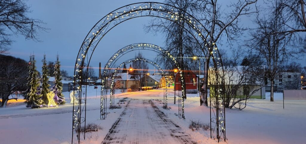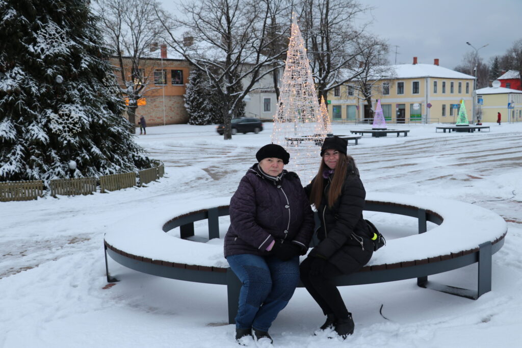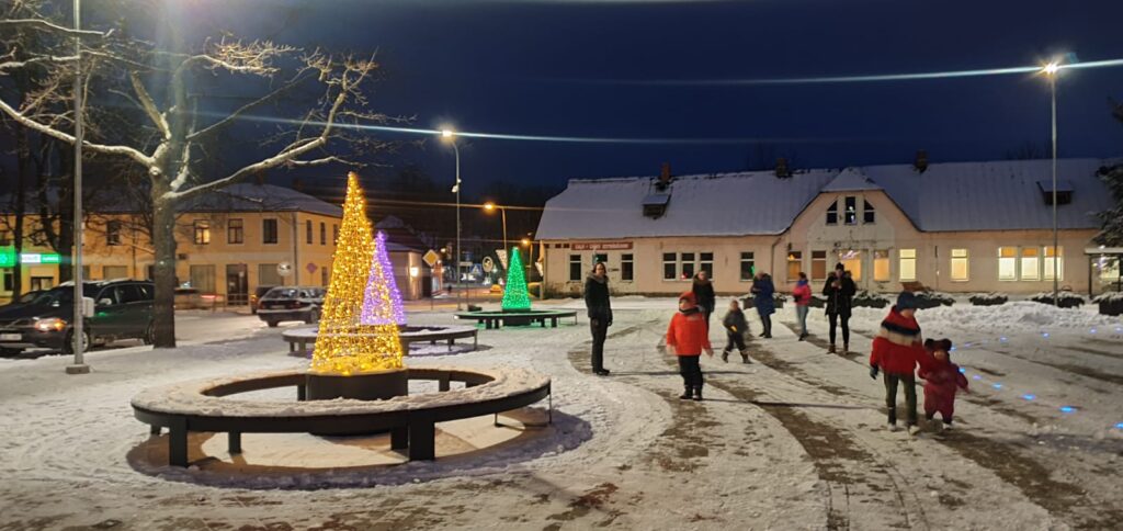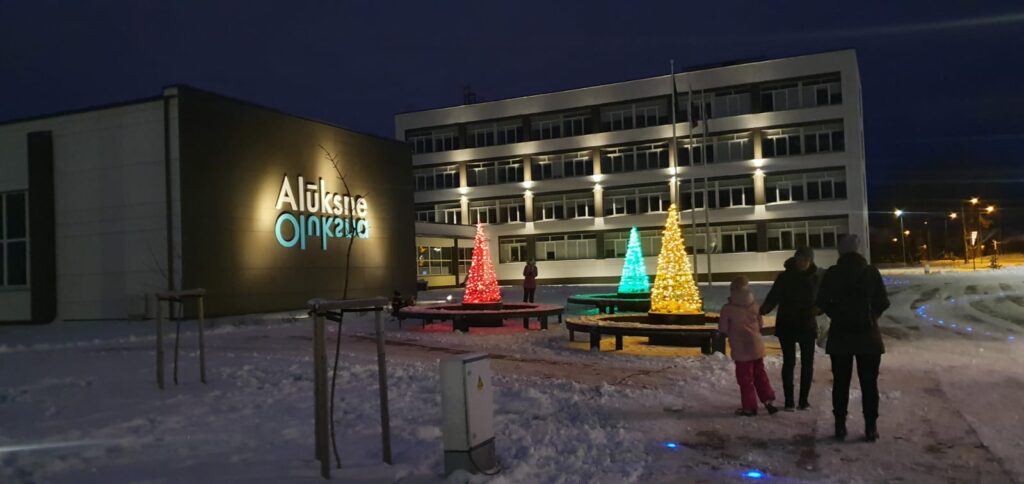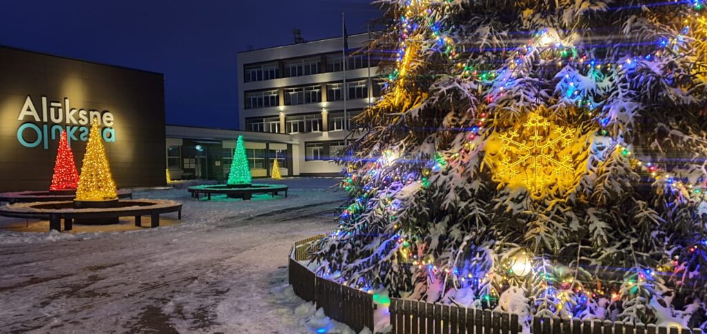 Pirmajā adventē iemirdzējusies egle Alūksnes novada administratīvās ēkas laukumā.