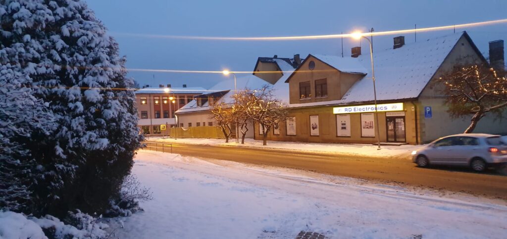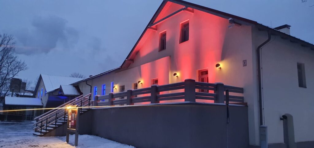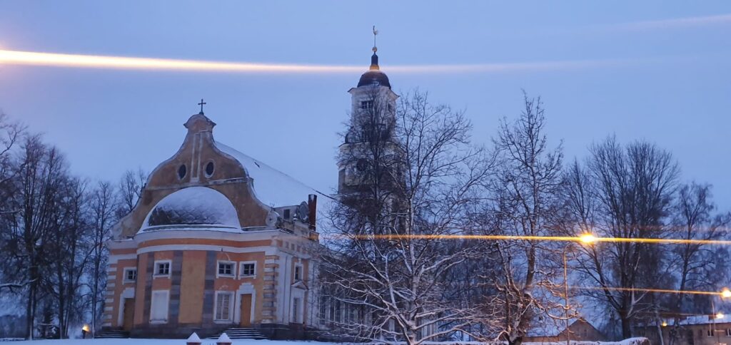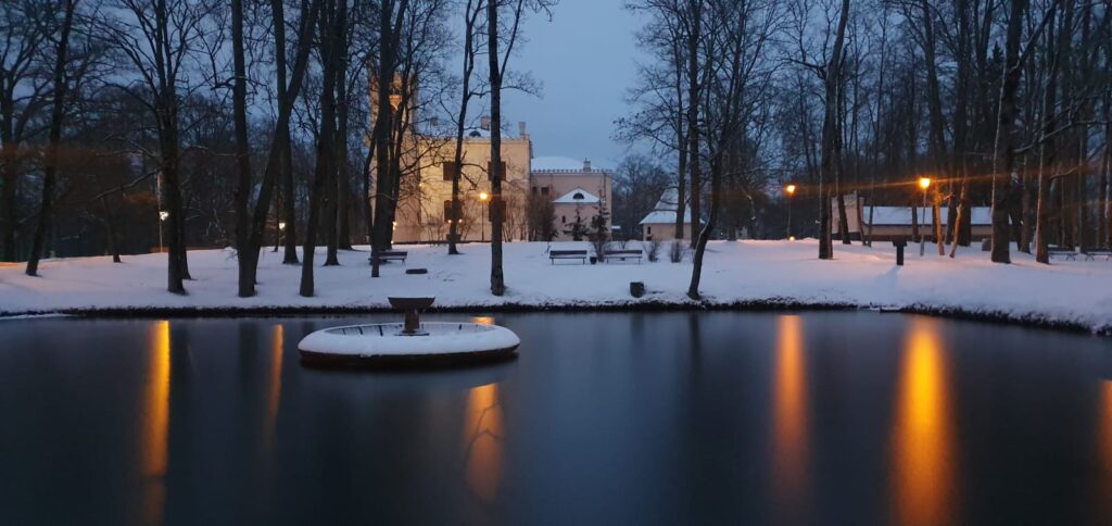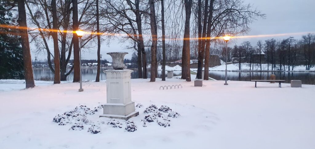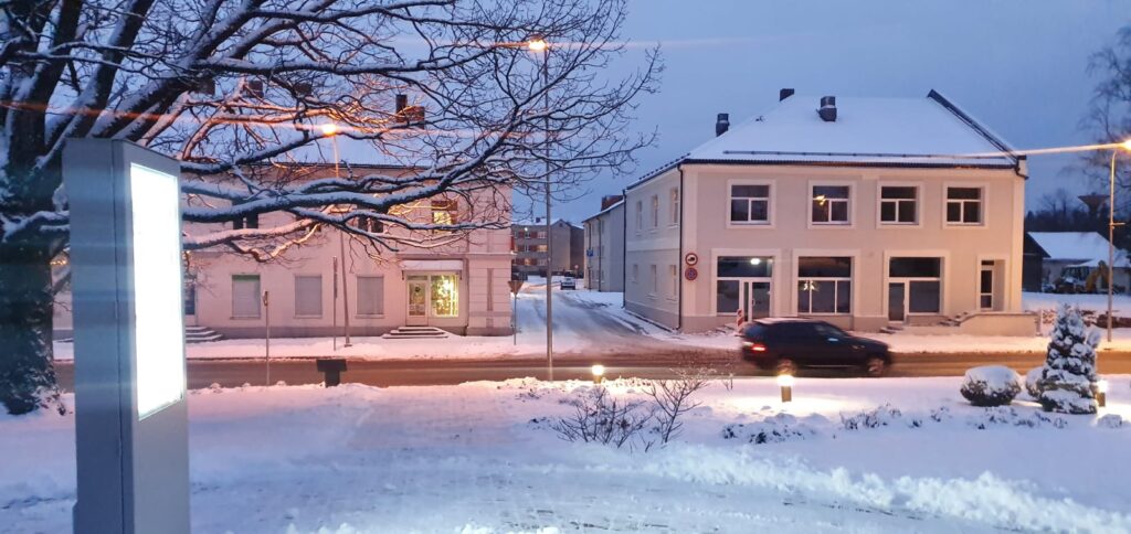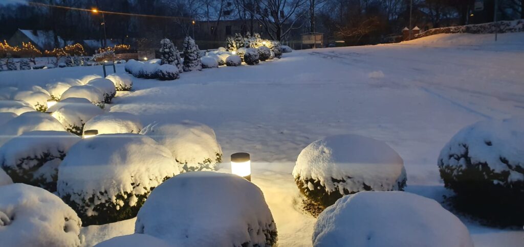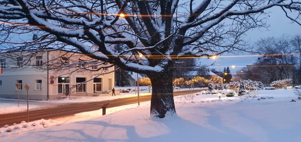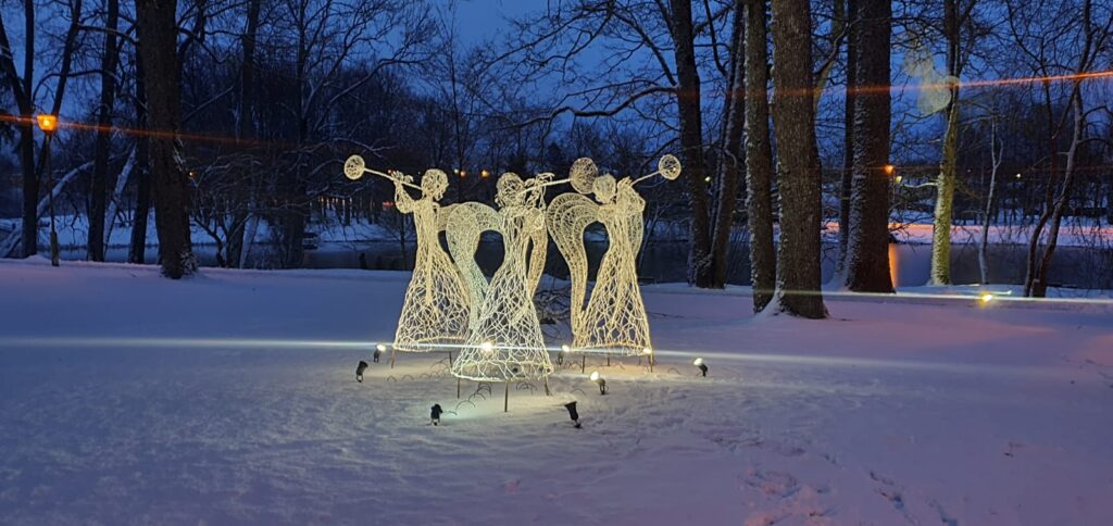 Pirmajā adventē iemirdzējusies egle Alūksnes novada administratīvās ēkas laukumā.