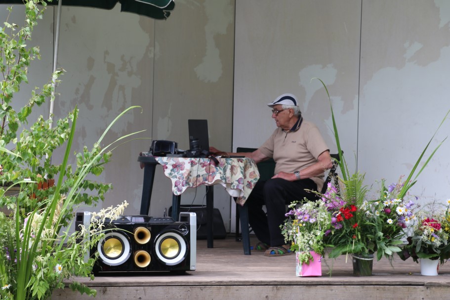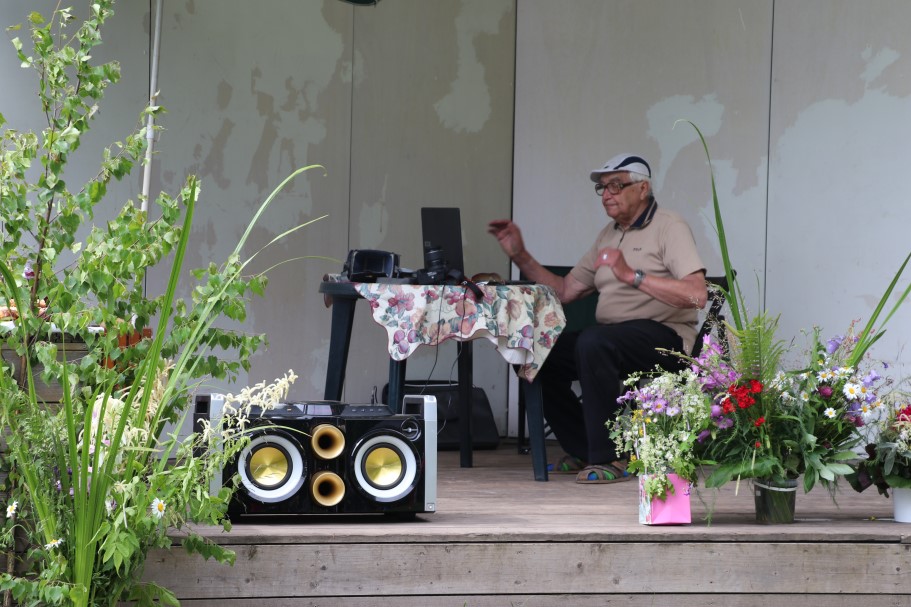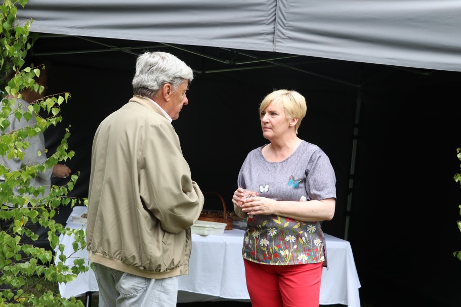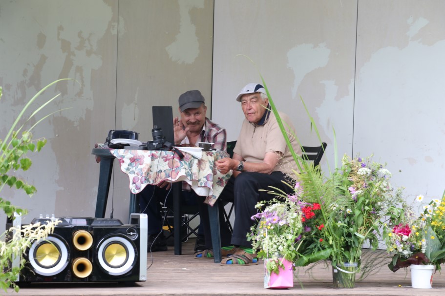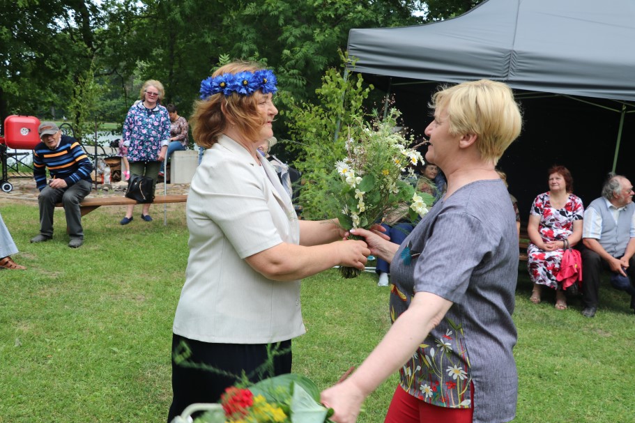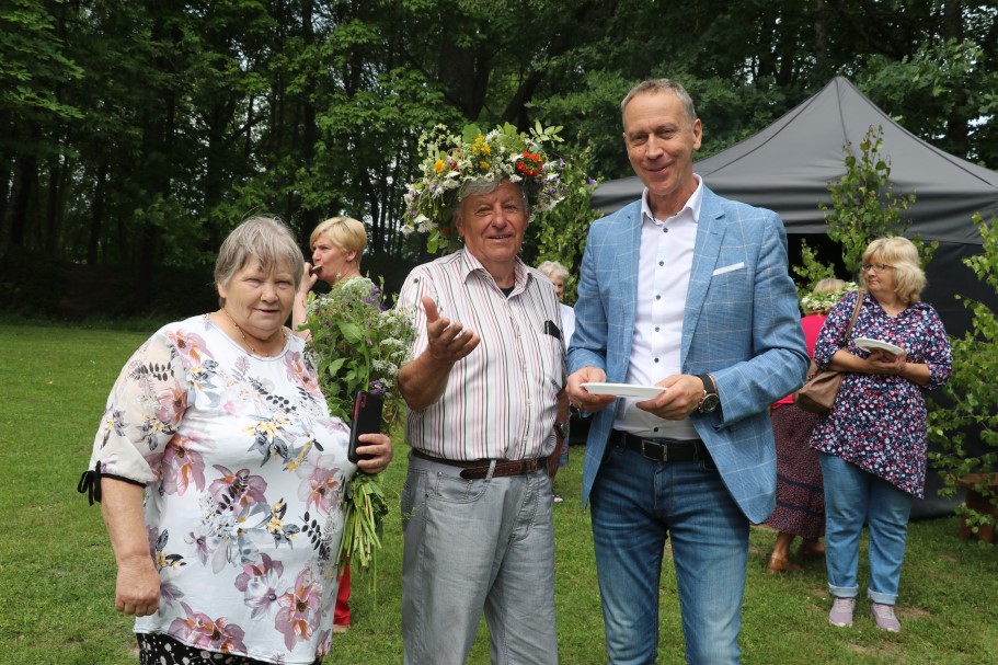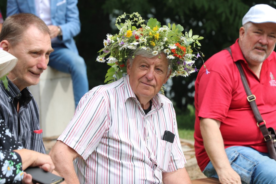 Priecīgus Jāņus un lustīgu noskaņojumu visiem vēlēja Alūksnes Invalīdu biedrības priekšsēdētājs Edvīns Svars. Sveicienus svētkos alūksniešiem nesa un E. Svaram Jāņu vainagu dāvināja Balvu Invalīdu biedrības pārstāvji. Kopā ar viņiem bija arī Alūksnes novada pašvaldības domes priekšsēdētājs Dzintars Adlers.