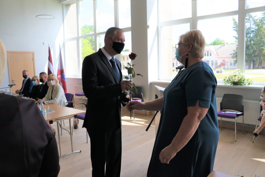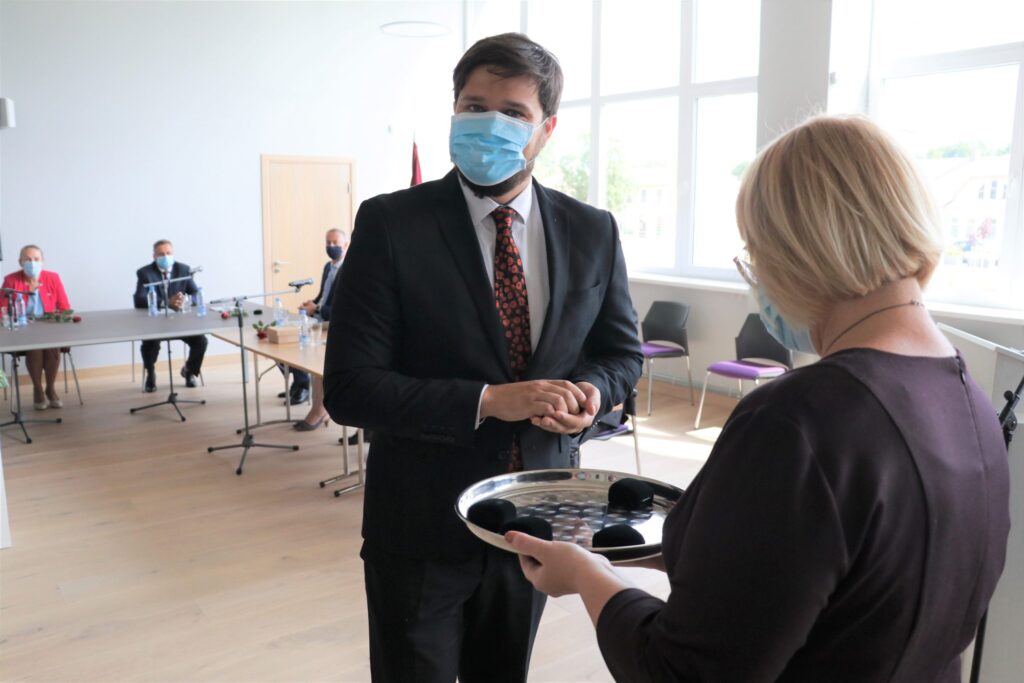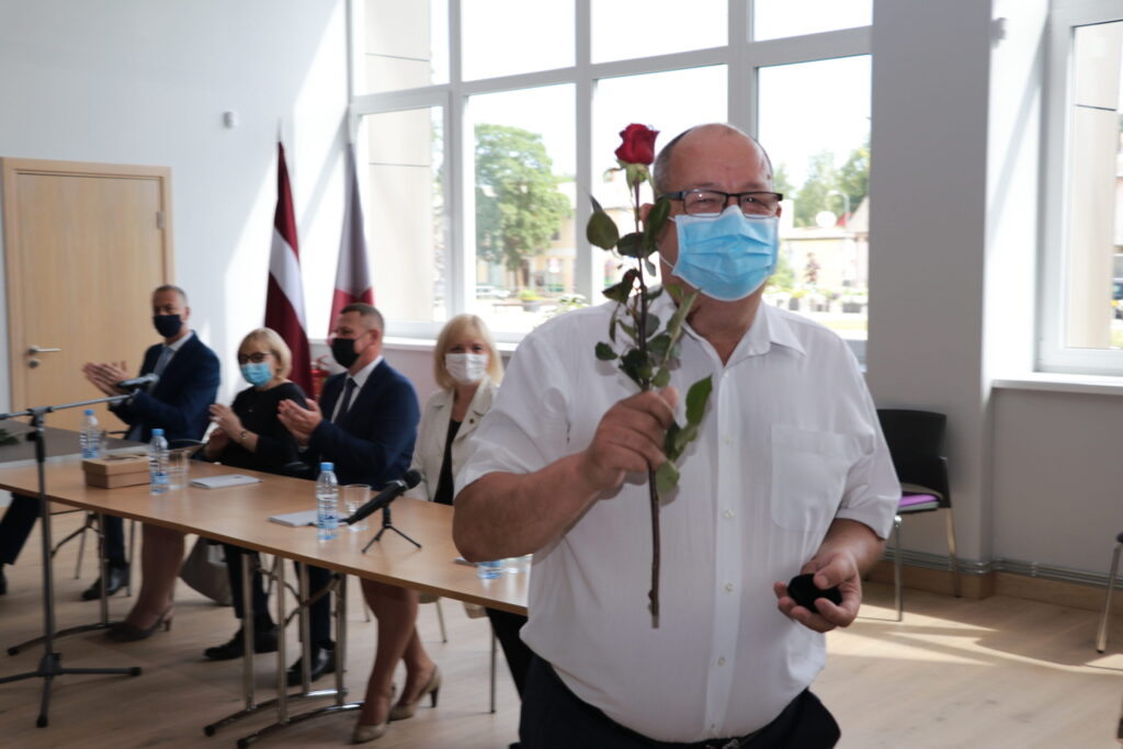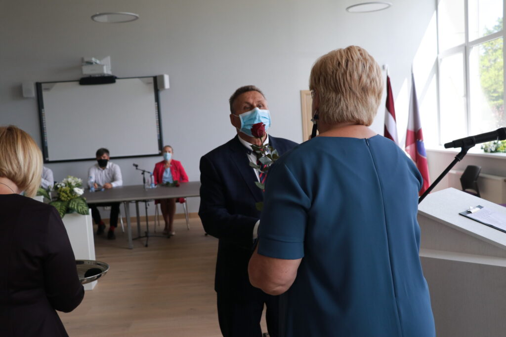 Uzsākot domes sēdi katram kandidātam tika pasniegta krūšu nozīme, kā apliecinājums tam, ka viņi kļuvuši par Alūksnes novada deputātiem.