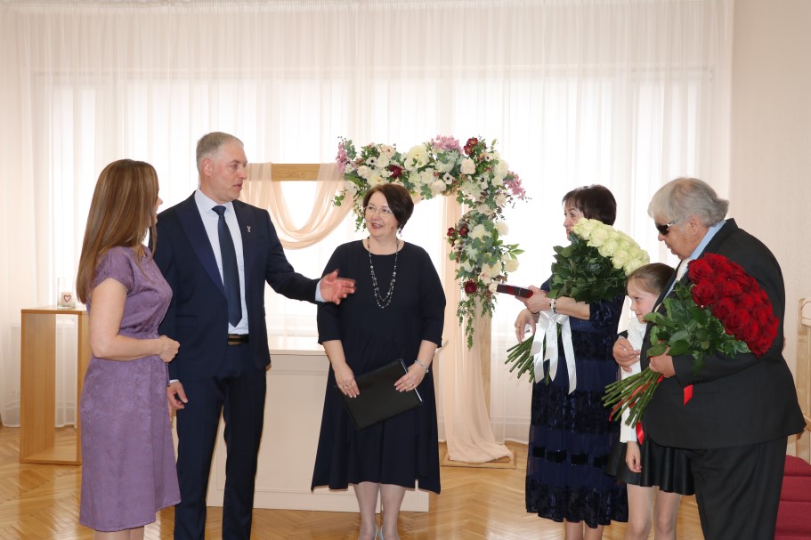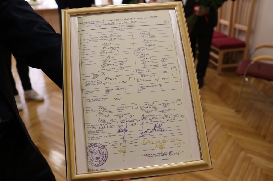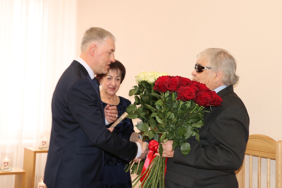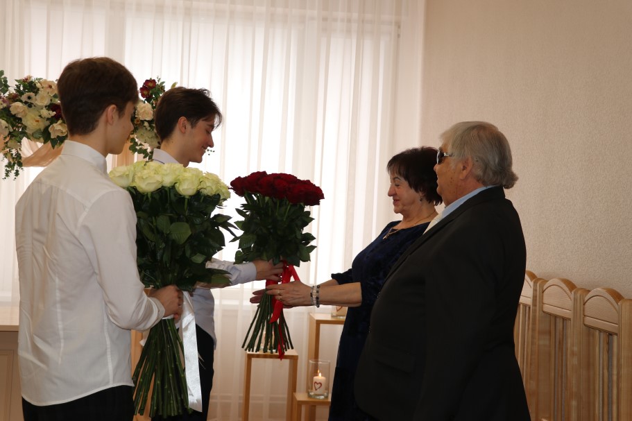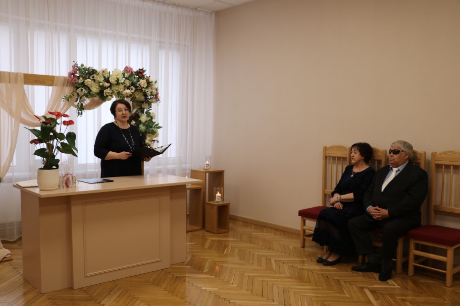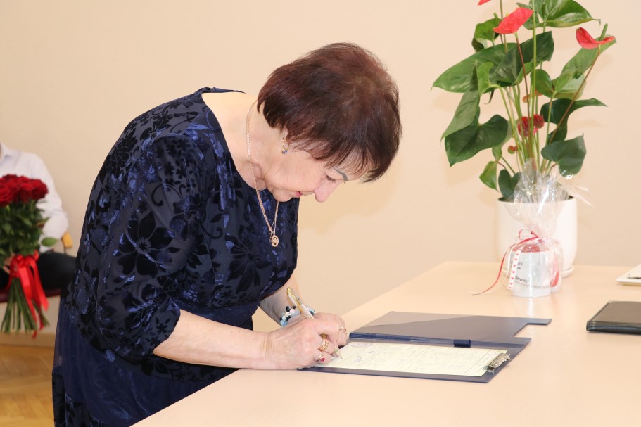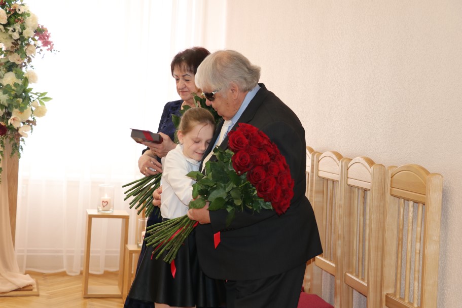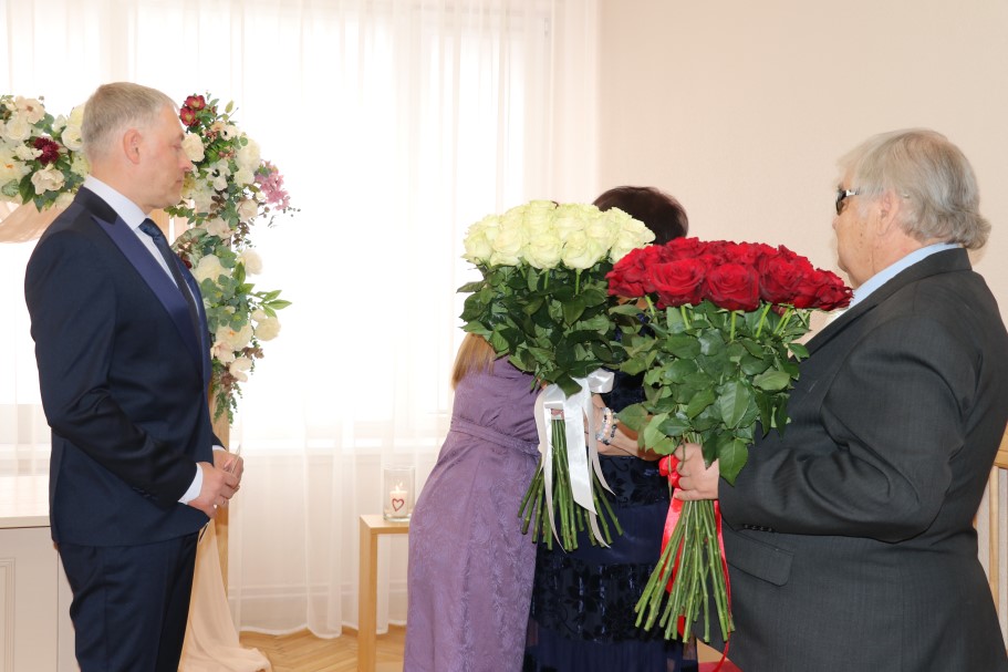 “Alūksne ir īpaša vieta, kur slēgt laulību. Te ir savi, īpašie mīlestības stāsti un teikas, mīlestības apvītas vietas. Šeit dzīvo labi cilvēki, šeit ir paaudzēs krāts spēks un stiprums, mīlestība pret šo vietu un vienam pret otru. Sakot, es mīlu tevi, katrs šajos vārdos ieliek savu īpašo jēgu, jo tie nav vienkārši vārdi, tajos slēpjas ticība, cerība un mīlestība. Laulība un ģimene ir spārni, kas cilvēku ceļ,” sveicot Račiku pāri skaistajā dzīves jubilejā, teica Alūksnes novada Dzimtsarakstu nodaļas vadītāja Inga Ozoliņa. Viņa bija sarūpējusi izrakstu no toreizējā Dzimtsarakstu nodaļas laulību reģistra, kas apliecināja abu noslēgto savienību. Maruta un Andris toreizējo izvēli vēlreiz apliecināja ar saviem parakstiem, lai šo dokumentu turpmāk mūžīgi glabātu savās mājās.