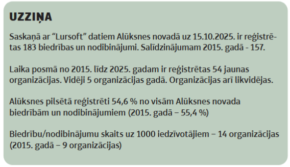 “Tas ir pozitīvi, jo saimnieciskā darbība rada zināmu drošības spilvenu un stabilitāti – tā ļauj piesaistīt resursus arī ārpus projektiem, tostarp sadarbojoties ar dažādām institūcijām. Ieņēmumi ir ļoti atšķirīgi, taču kopā tie veido 265 758 eiro,” skaidro S. Harjo – Ozoliņa. Tikai trīs organizācijas – “Ērmaņu muiža”, “Alūksnes un Apes novada fonds” un “Alūksnes lauku partnerība” – 2024. gadā savos pārskatos norādījušas krājumus, kuru kopējā vērtība ir 2343 eiro. Savukārt sešas organizācijas norādījušas, ka to īpašumā atrodas transportlīdzekļi, tostarp piekabes – kopumā astoņas vienības. Vēl trīs organizācijas ziņojušas par nekustamo īpašumu esamību savā īpašumā – kopumā trīs vienības, kas pieder mednieku kolektīviem.