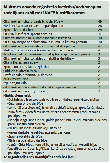 “Aplūkojot kopainu, man šķita svarīgi paraudzīties, kāds patiesībā ir novada nevalstisko organizāciju (NVO) sektors. Aplūkojot organizāciju sadalījumu pa darbības jomām, redzams, ka lielākā daļa ietilpst kategorijā “citur neklasificētu organizāciju darbība”. Tas nozīmē, ka tās darbojas ar kopienu aktivitātēm vai citām iniciatīvām, kas neiekļaujas sporta, kultūras vai sociālajā jomā – viss neierastais un radošais parasti nonāk tieši šajā grupā. Būtiska daļa organizāciju darbojas medniecības jomā, jo tieši šādā juridiskā formātā darbojas mednieku klubi. Tādēļ mūsu teritorijā šo organizāciju ir salīdzinoši daudz. Savukārt pēdējos gados arvien vairāk veidojas biedrības māju apsaimniekošanai – tās dibina īpašnieki, kuru īpašumos ir vairāk nekā viens dzīvoklis. Šāds juridiskais risinājums ļauj efektīvāk pārvaldīt mājas, un šādu biedrību skaits novadā ar katru gadu pieaug,” stāsta S. Harjo – Ozoliņa.