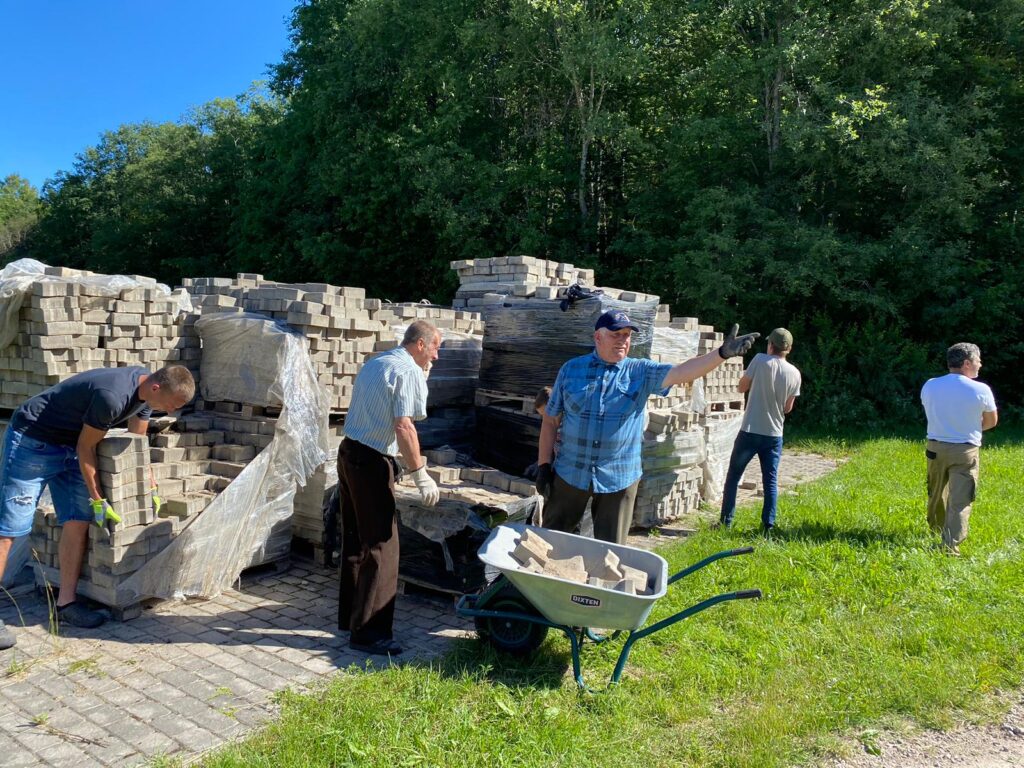 Pamatni bruģa ieklāšanai sagatavoja projekta ietvaros, starpslāni uzbēra Smiltenes tehnikuma audzēkņi. “Paldies Smiltenes tehnikuma puišiem, direktoram Rolandam Aģim un skolotājam Aivaram Birkenšteinam, kuri, pilnveidojot mācību procesa norisi, atbrauca uz Gaujienu. Tā kā finanses bija izsīkušas, tomēr optimistisko noskaņu bruģi ieklāt pašu spēkiem nezaudējām. Nezinu, vai mums tas būtu izdevies, bet talkai pieteicās četri gaujienieši – Zorislavs Paeglis, Ruslans Ponaida, Gunārs Rebainis un Fēlikss Bukoveckis, kuri pagastā ikdienā nedzīvo, bet bija ieradušies Gaujienā brīvdienās. Viņi ir profesionāļi dažādos būvniecības darbos, tāpēc šī palīdzība bija ļoti vērtīga. Viņi izdarīja lauvas tiesas darbu. Mēs, pārējie talcinieki, tik vien spējām pienest bruģi, jo darba tempi bija ļoti strauji. Visu segumu gan vienā dienā ieklāt fiziski nepaspējām,” stāsta I. Avota.