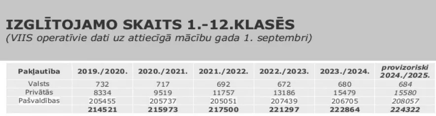 Skolēnu skaits pašvaldību skolās būtiski nemainās. 2019./ 2020. mācību gadā 1. līdz 12. klasē pašvaldību skolās mācījās 205 455 skolēni, bet jaunajā mācību gadā skaits ir palielinājies par trim tūkstošiem – 208 057. To skaitā ir arī bērni no Ukrainas, kuri mācās skolās Latvijā. I. Dundure teic, ka šobrīd skolēnu skaita līdzsvars tiek saglabāts, un pauž cerību, ka tā tas būs arī nākotnē. Tomēr skolu darbs nav iedomājams bez skolotājiem, tādēļ svarīgs ir arī to skaits. “Skolotājs ir atslēgas vārds gan izglītības kvalitātei, gan tam, vai skolēns izvēlas tuvējo skolu vai tomēr labāk brauc tālāk un ilgāk pavada ceļā, jo tur ir labāks, piemēram, matemātikas skolotājs. Augustā veiktā aptauja atklāja, ka skolās vakantas bija 876,8 likmes, pašvaldību izglītības iestādēs – 793,5. Varbūt šobrīd situācija ir labāka, jo pašvaldības meklē risinājumus, proti, skolotāji brauc strādāt no blakus novadiem, strādā vairākas slodzes, tomēr vidējais iztrūkums nemazinās. Visvairāk trūkst pedagogu pirmsskolas izglītības iestādēs, īpaši lielajās pilsētās – Rīgā un Pierīgā, jo tur izvēles iespējas ir lielākas un pedagogi izvēlas strādāt citās nozarēs,” skaidro I. Dundure.