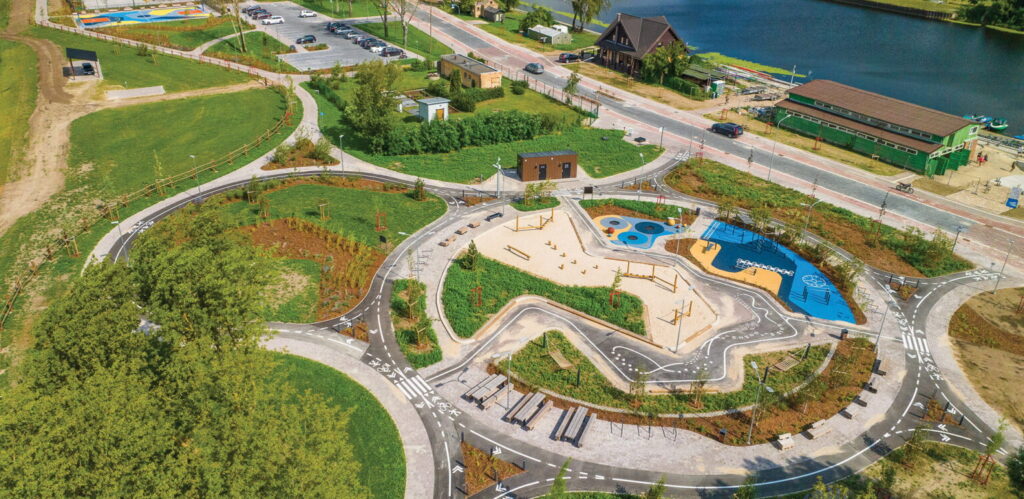 Teritorijā atrodas bērnu rotaļu laukums ar dažādām rotaļu iekārtām, tostarp batutiem un citiem fizisko aktivitāšu elementiem. Laukumā un līdzās tam izvietoti vairāki šūpuļtīkli, kā arī atpūtas soliņi. Vēl šī zona papildināta ar piknika galdiem. Savukārt ap rotaļu laukumu ierīkots skrituļošanas un veloceliņš. Turpat izveidots vingrošanas laukums ar dažādiem trenažieriem.