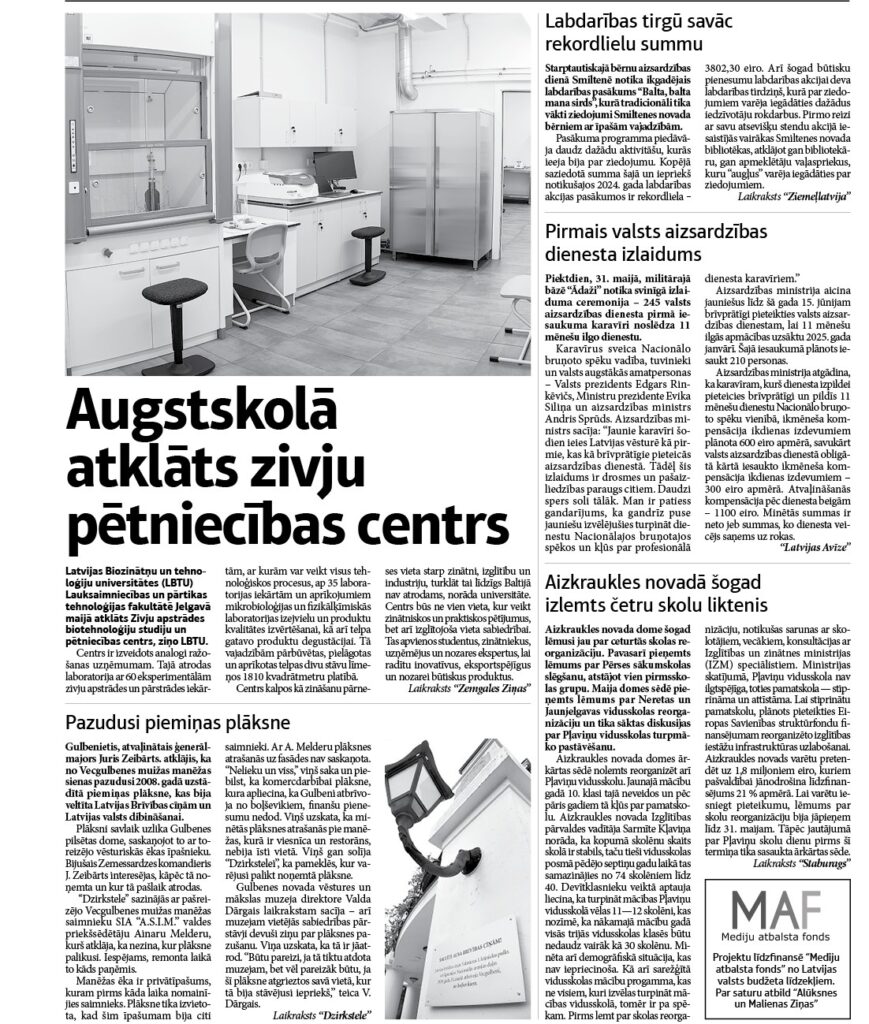 Latvijas Biozinātņu un tehnoloģiju universitātes (LBTU) Lauksaimniecības un pārtikas tehnoloģijas fakultātē Jelgavā maijā atklāts Zivju apstrādes biotehnoloģiju studiju un pētniecības centrs, ziņo LBTU.