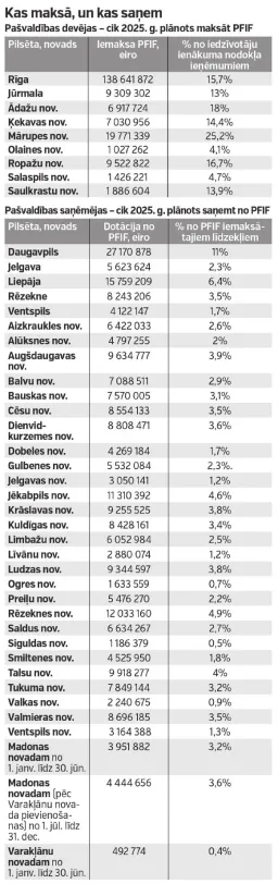 Rīgas plānotā iemaksa ir vislielākā – 138,6 miljoni eiro jeb 15,7 % no iedzīvotāju ienākuma nodokļa (IIN) ieņēmumiem. Cik maksās un cik saņems pārējie – skat. tabulu.