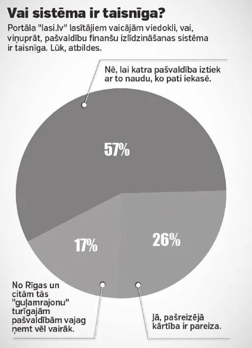 Lielākā vidējā mēneša bruto darba samaksa ir Rīgā un Rīgas reģionā. Tāpat šajā reģionā ir lielākais iedzīvotāju un darba vietu skaits, attiecīgi Pierīgas pašvaldībām ir arī lielākie IIN ieņēmumi. Līdzīga situācija ir arī ar nekustamā īpašuma nodokli – deviņu Rīgas reģiona pašvaldību nekustamā īpašuma nodokļa ieņēmumi, kas piedalās izlīdzināšanā, veido 64 % no kopējiem nekustamā īpašuma nodokļa ieņēmumiem PFI aprēķinā, un attiecīgi pārējo 34 pašvaldību daļa ir tikai 36 %. Vienlaikus jāatzīmē, ka Rīgas reģiona pašvaldībās deklarētā dzīvesvieta ir 47 % Latvijas iedzīvotāju,” “Latvijas Avīzei” vēsta Lāsma Ūbele.