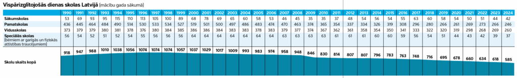 Kopš Latvijas neatkarības atgūšanas demogrāfiskās izmaiņas reģionos novedušas pie daudzu skolu slēgšanas. Centrālās statistikas pārvaldes dati liecina, ka 1991. gadā vispārizglītojošās dienas skolas Latvijā kopā bija 947. Vislielākais to skaits bijis 1996. – 1998. gadā – kopā 1074 skolas. Bet šo gadu laikā tas samazinājies gandrīz divkārt – 2024. gadā uzskaitītas 585 vispārizglītojošās skolas.