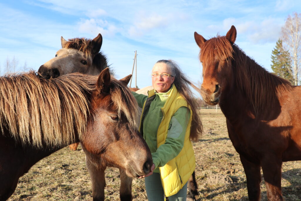 Zirgaudzētāja ar mīlestību stāsta par saviem mīluļiem, to izcelsmi, šķirnēm, hierarhiju, krāsu atšķirībām starp Somijas un Latvijas rumakiem, priecājas par garajām Latvijas vasarām un dusmojas vienīgi uz dunduriem. Jautāta, cik liels ganāmpulks viņai ir, Taina atsmej: “Pārāk liels!”. Fotografēšanās nav vienkārša, jo Taina pieskata, vai zirgu ausis ir skaisti izslējušās, jo šķirnes zirgiem bildēs nepieklājas izskatīties šā tā. Skaistie dzīvnieki ir ļoti ieinteresēti fotosesijā, jo, kā stāsta saimniece, ciemiņi šeit ir reti, Taina dzīvo viena. Jautāta, kādā valodā viņa runā ar saviem zirgiem, jo nu jau ganāmpulkā ir arī Latvijā dzimušie, somiete stāsta, ka tas ir spontāni, un paglāsta zirdziņu Laima, sakot: “Mīļa, mīļa!”