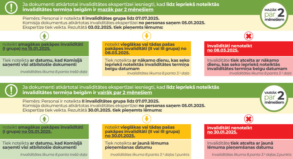 Personām jāņem vērā arī tas, ka šobrīd atkārtotas invaliditātes termiņa sākuma datums ir atkarīgs no dokumentu iesniegšanas laika invaliditātes ekspertīzei Komisijā. Atkārtotas invaliditātes termiņa pirmā diena ir atkarīga no tā, vai persona dokumentus iesniedz laikā, kad līdz esošās invaliditātes termiņa beigām ir mazāk par diviem mēnešiem vai vairāk par diviem mēnešiem.