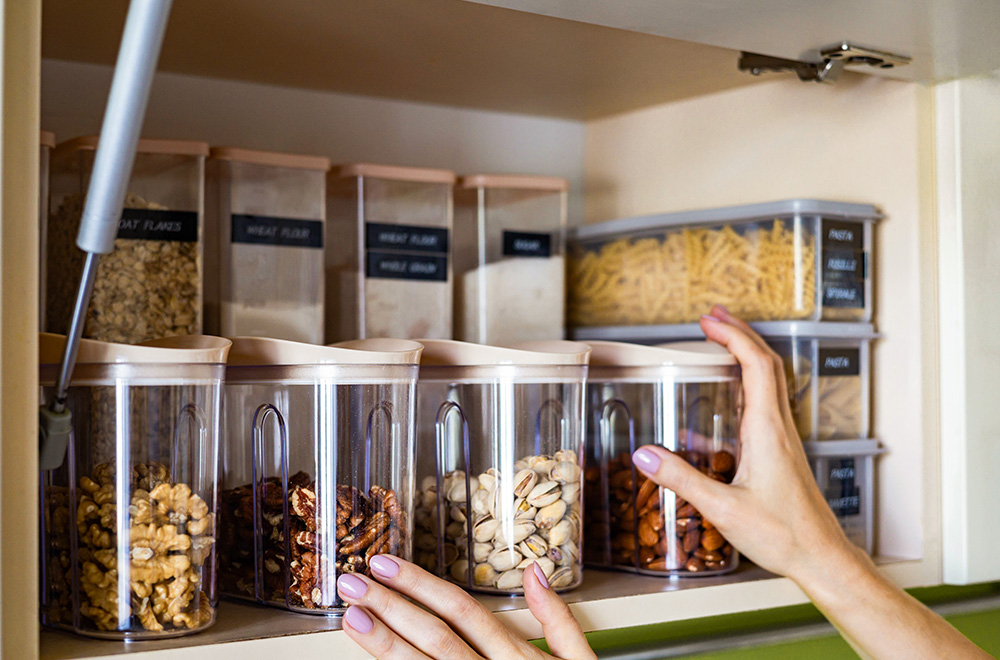 ALT: Sieviete uzstāda virtuves skapī plastmasas pārtikas traukus ar riekstiem un žāvētiem augļiem
