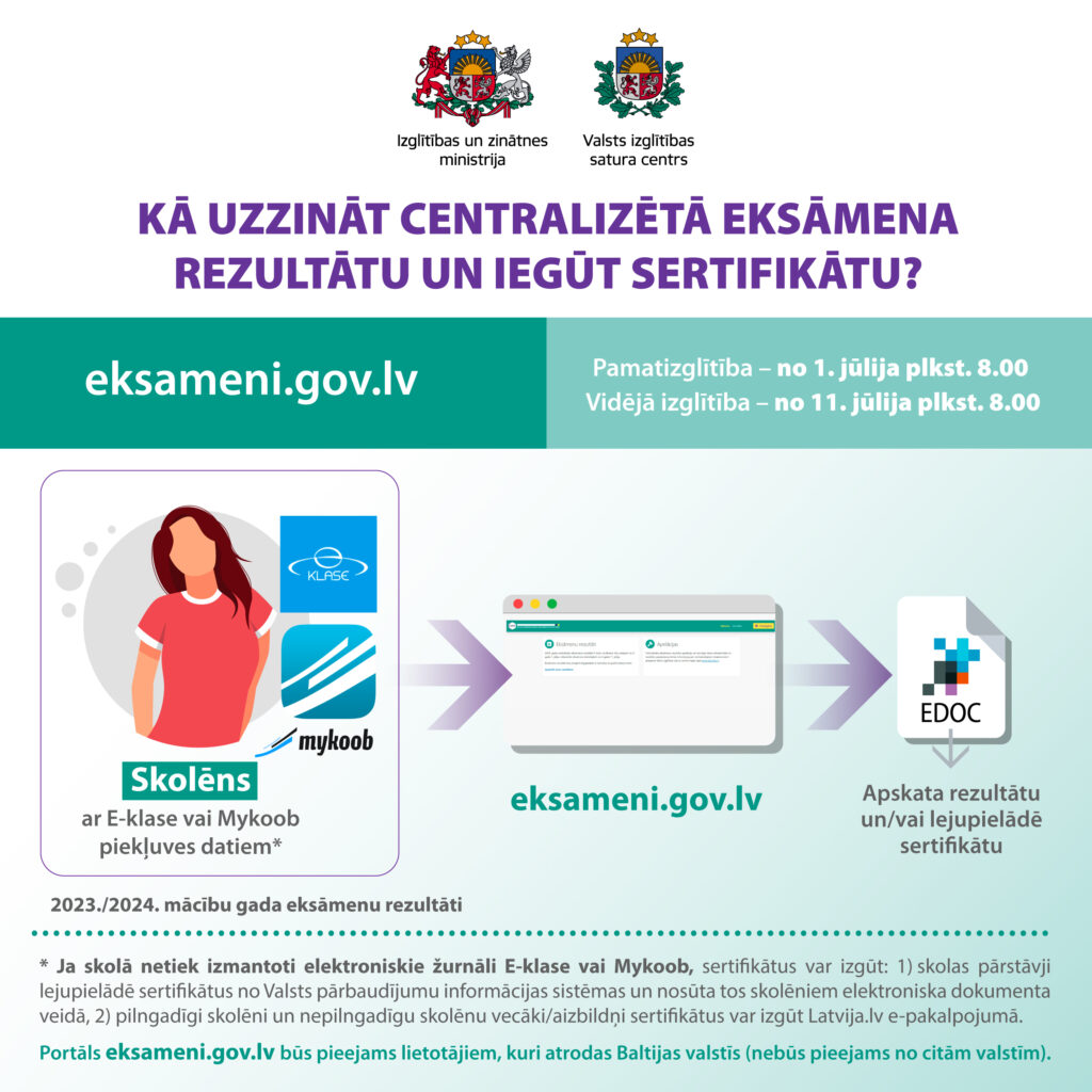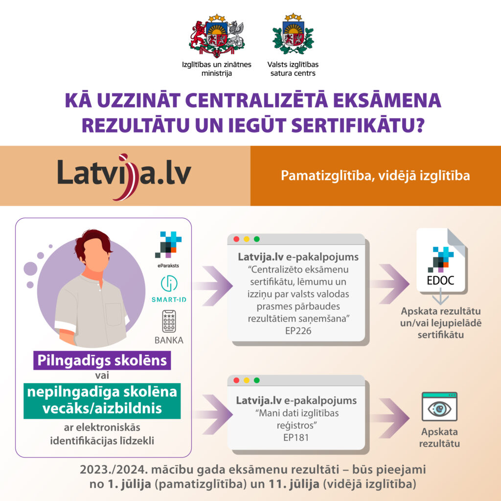 Pilngadīgi skolēni vai nepilngadīgu skolēnu vecāki no 1. jūlija (par pamatizglītību) vai 11. jūlija (par vidējo izglītību) var iegūt informāciju un/vai sertifikātu portāla Latvija.lv e-pakalpojumos Nr.EP226 “Centralizēto eksāmenu sertifikātu, lēmumu un izziņu par valsts valodas prasmes pārbaudes rezultātiem saņemšana” un Nr.EP181 “Mani dati izglītības reģistros”.