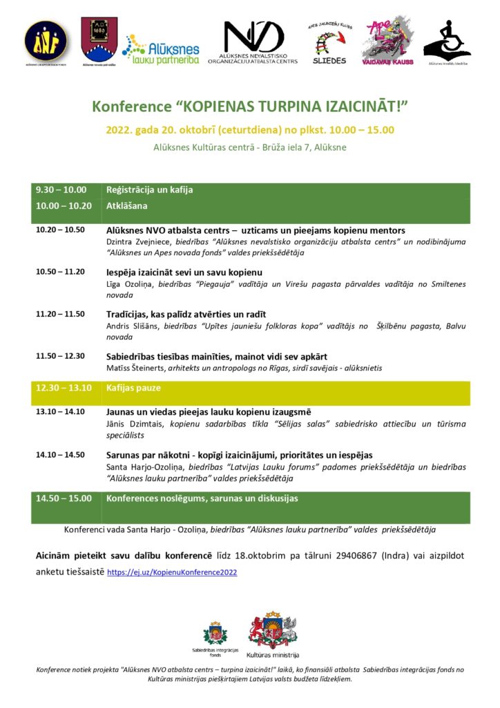 Dalība konferencē jāpiesaka līdz 18.oktobrim pa tālruni 29406867 (Indra) vai aizpildot anketu https://ej.uz/KopienuKonference2022